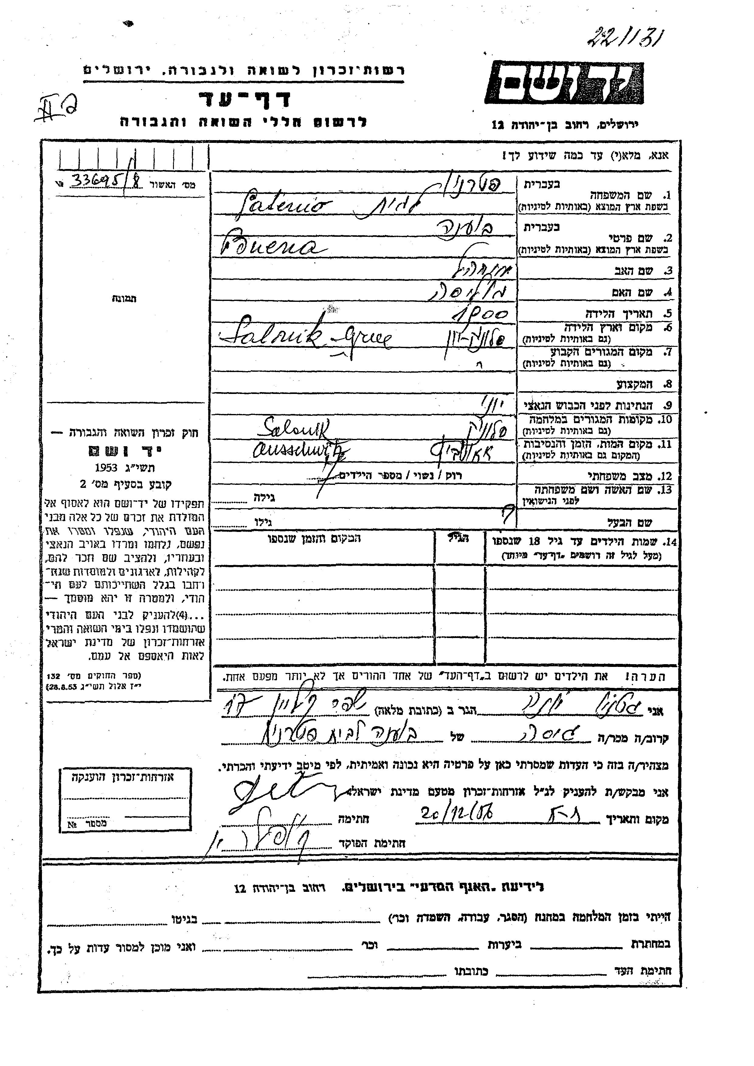 Buena Name unbekannt, geb. Paternio wurde im Jahr 1900 in Saloniki, Griechenland geboren. Sie war die Tochter von Mikhael und Bulisa. Sie war Verheiratet. Vor dem Zweiten Weltkrieg lebte sie in Saloniki, Griechenland. Während des Krieges war sie in Saloniki, Griechenland.
