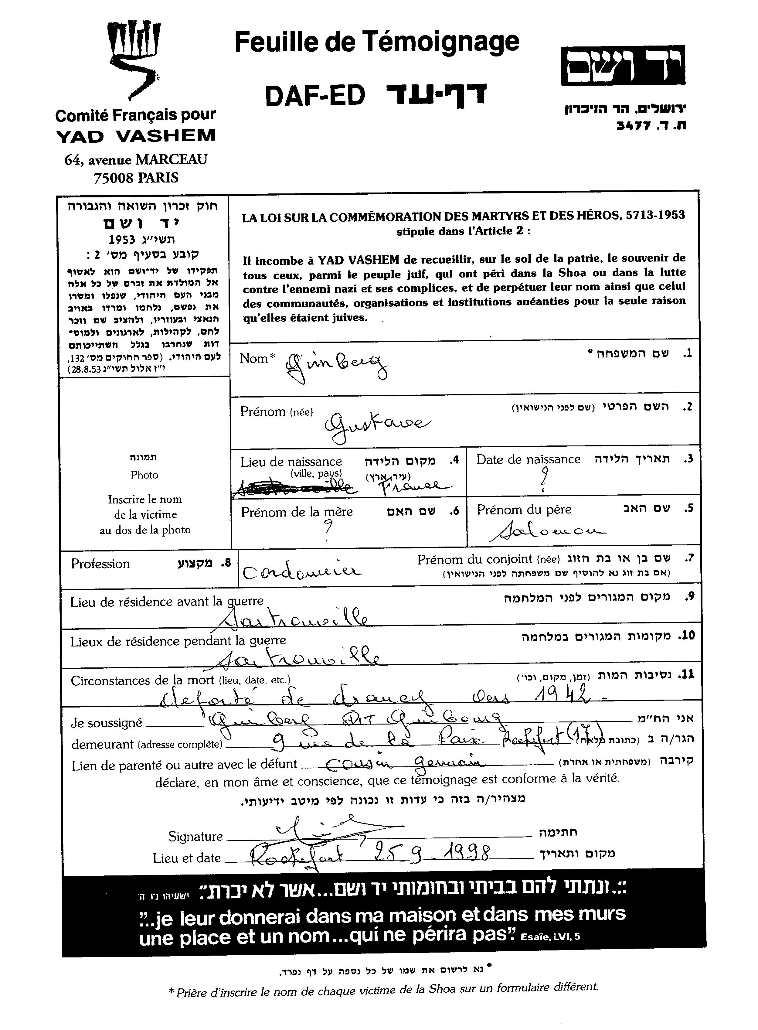 Gustave wurde in der Schoah ermordet. Todesort: unbekannt im Jahr 1942.