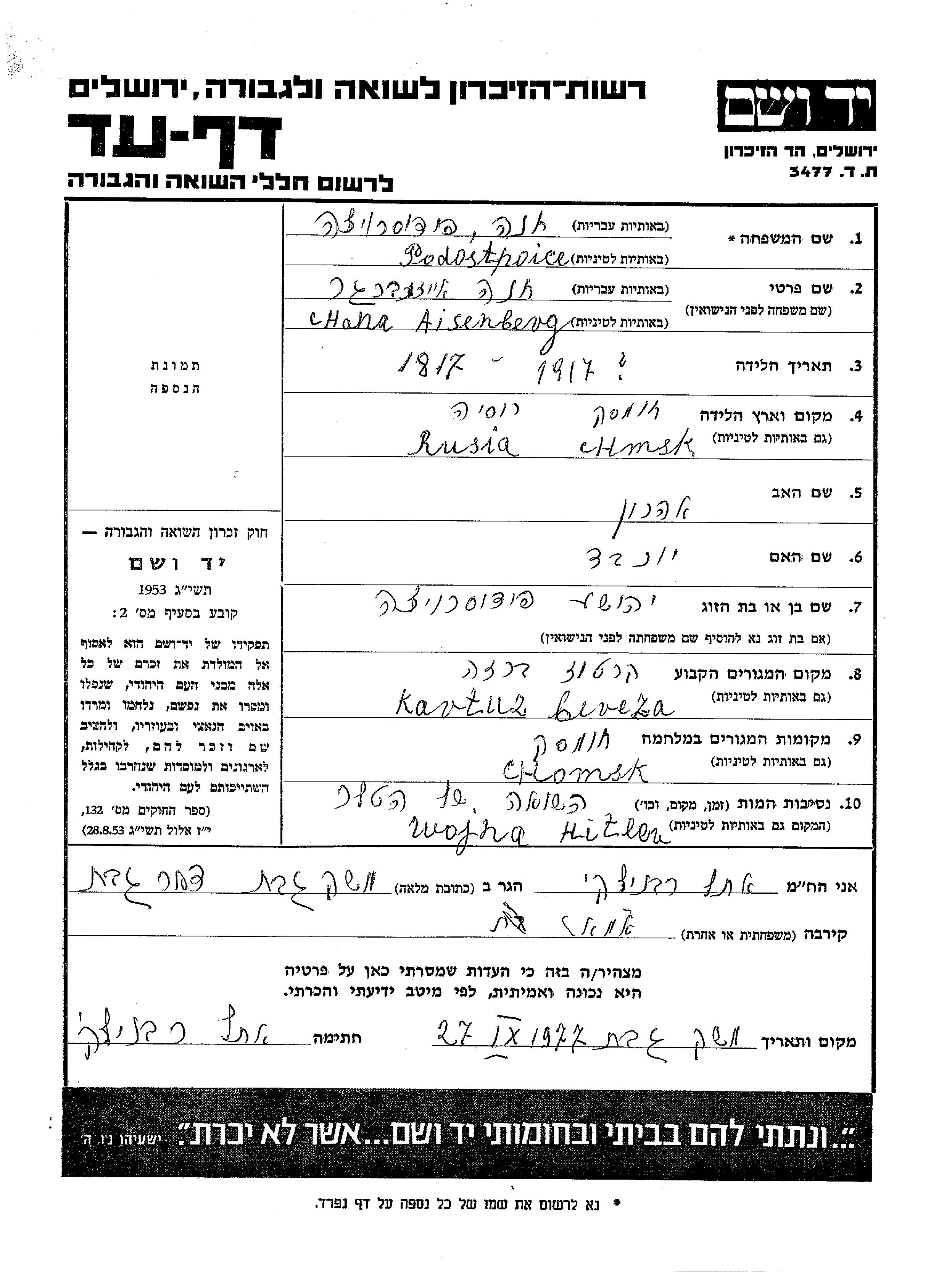 Chana Podostroice Aisenberg Eizenberger wurde im Jahr 1917 in Chomsk, Polen geboren. Sie war die Tochter von Aharon und Yokheved. Sie war mit Yehoshua Verheiratet. Vor dem Zweiten Weltkrieg lebte sie in Kartuz Bereze, Polen. Während des Krieges war sie in Chomsk, Polen.