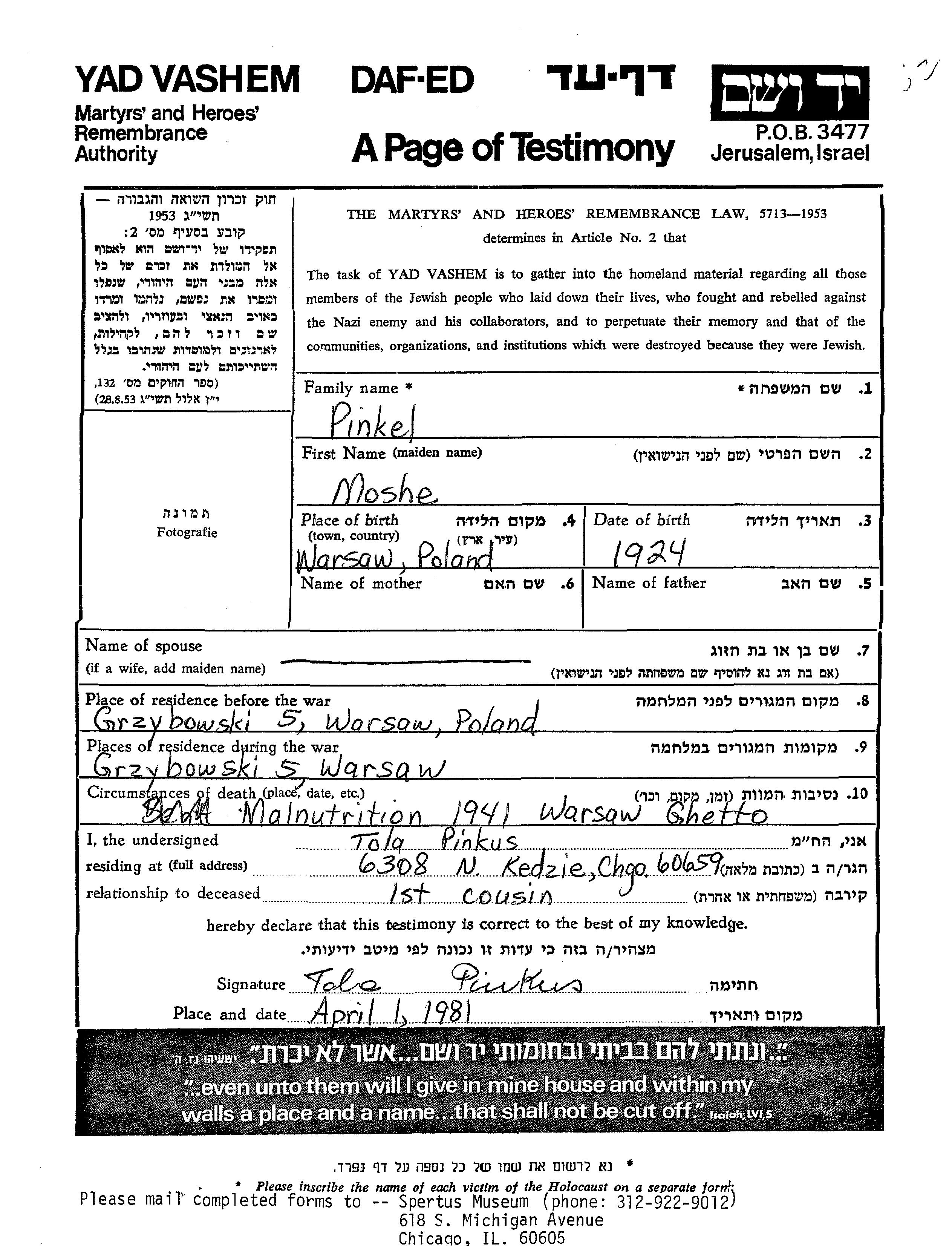 Moshe Pinkel wurde im Jahr 1924 in Warsaw, Polen geboren. Vor dem Zweiten Weltkrieg lebte er in Warsaw, Polen. Während des Krieges war er in Warsaw, Polen.