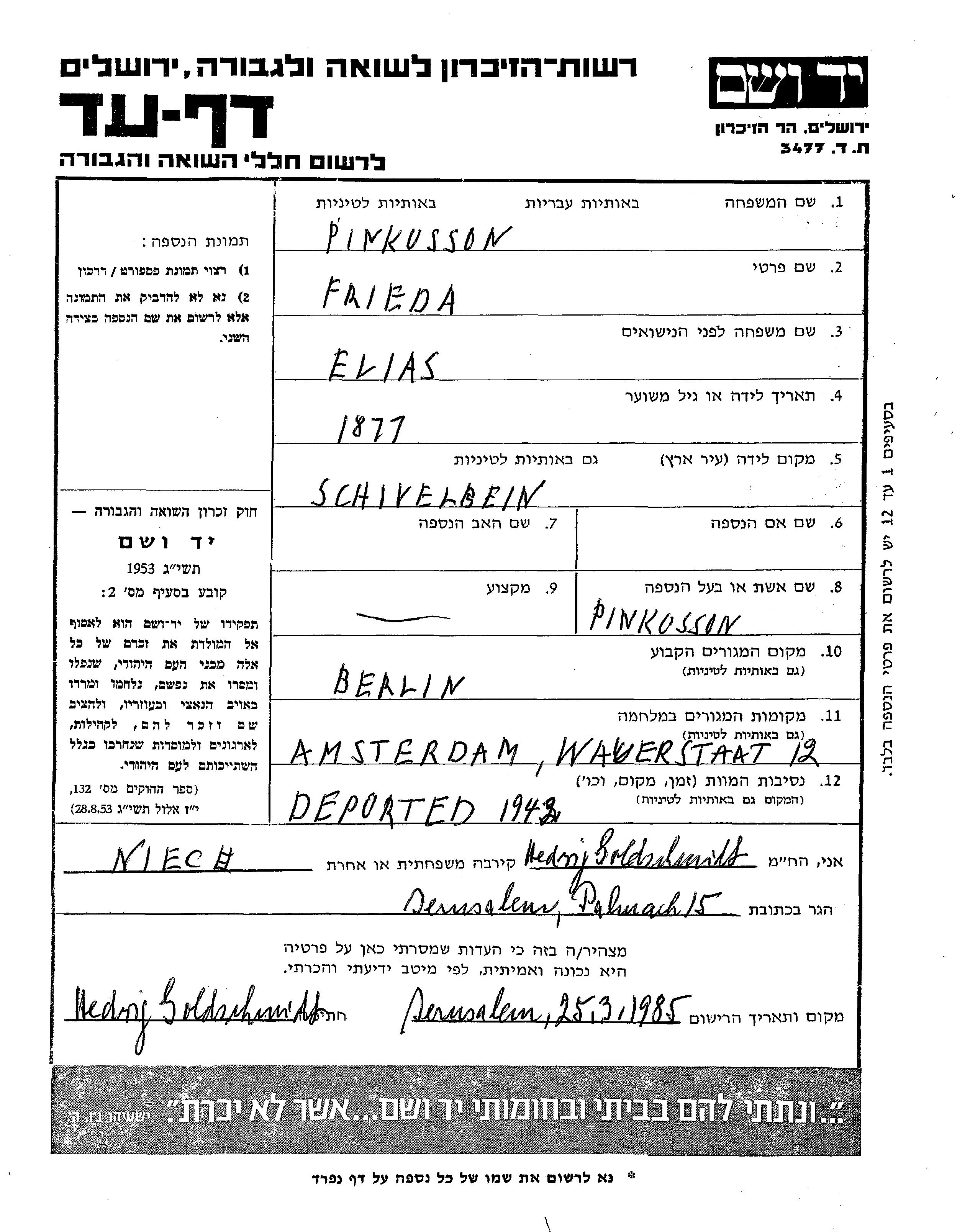 Frieda Pinkusson, geb. Elias wurde im Jahr 1877 in Schivelbein, Deutsches Reich geboren. Vor dem Zweiten Weltkrieg lebte sie in Berlin, Deutsches Reich. Während des Krieges war sie in Amsterdam, Niederlande.