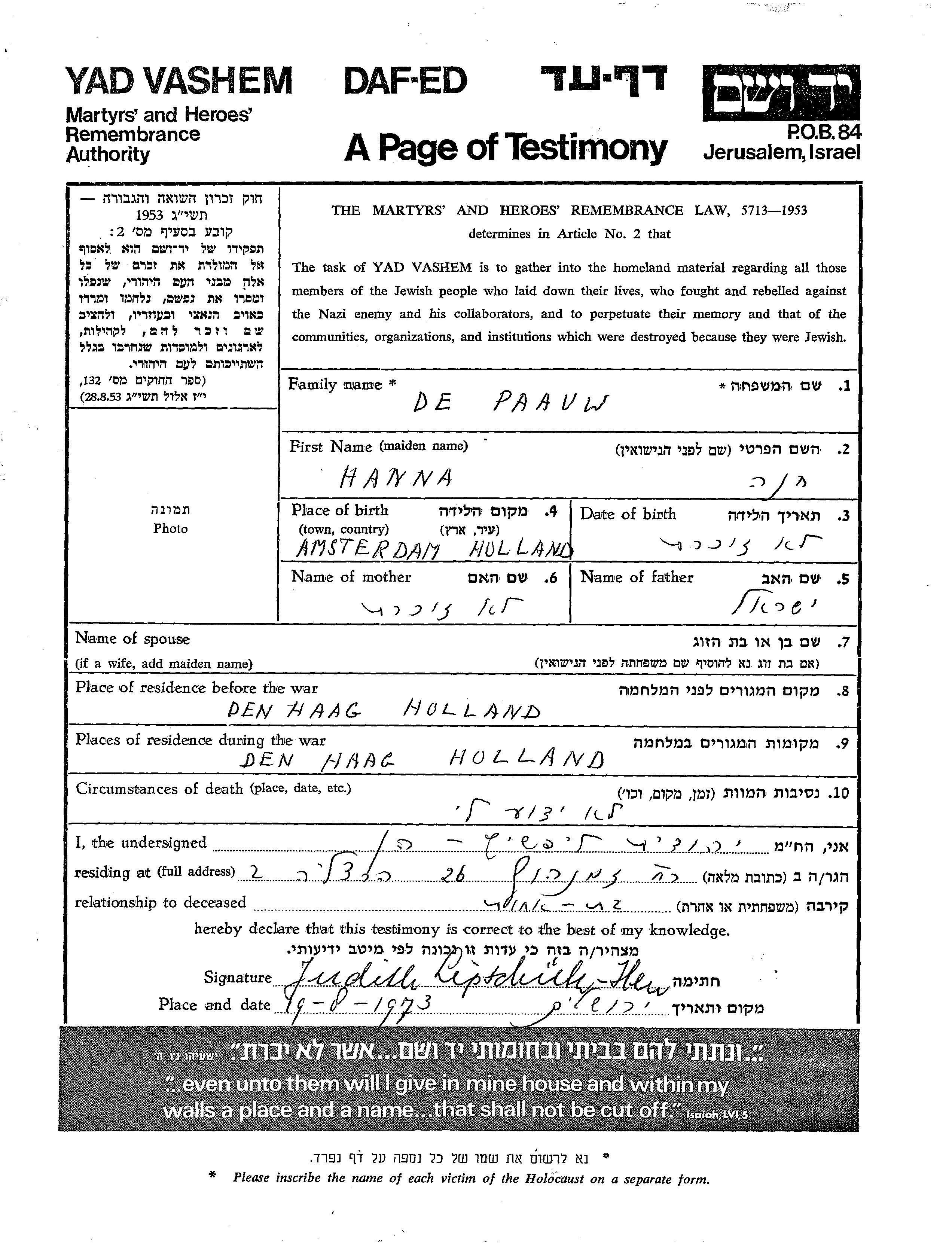 Hanna Paauw de wurde in Amsterdam, Niederlande geboren. Sie war die Tochter von Yisrael. Vor dem Zweiten Weltkrieg lebte sie in Den Haag, Niederlande. Während des Krieges war sie in Den Haag, Niederlande.