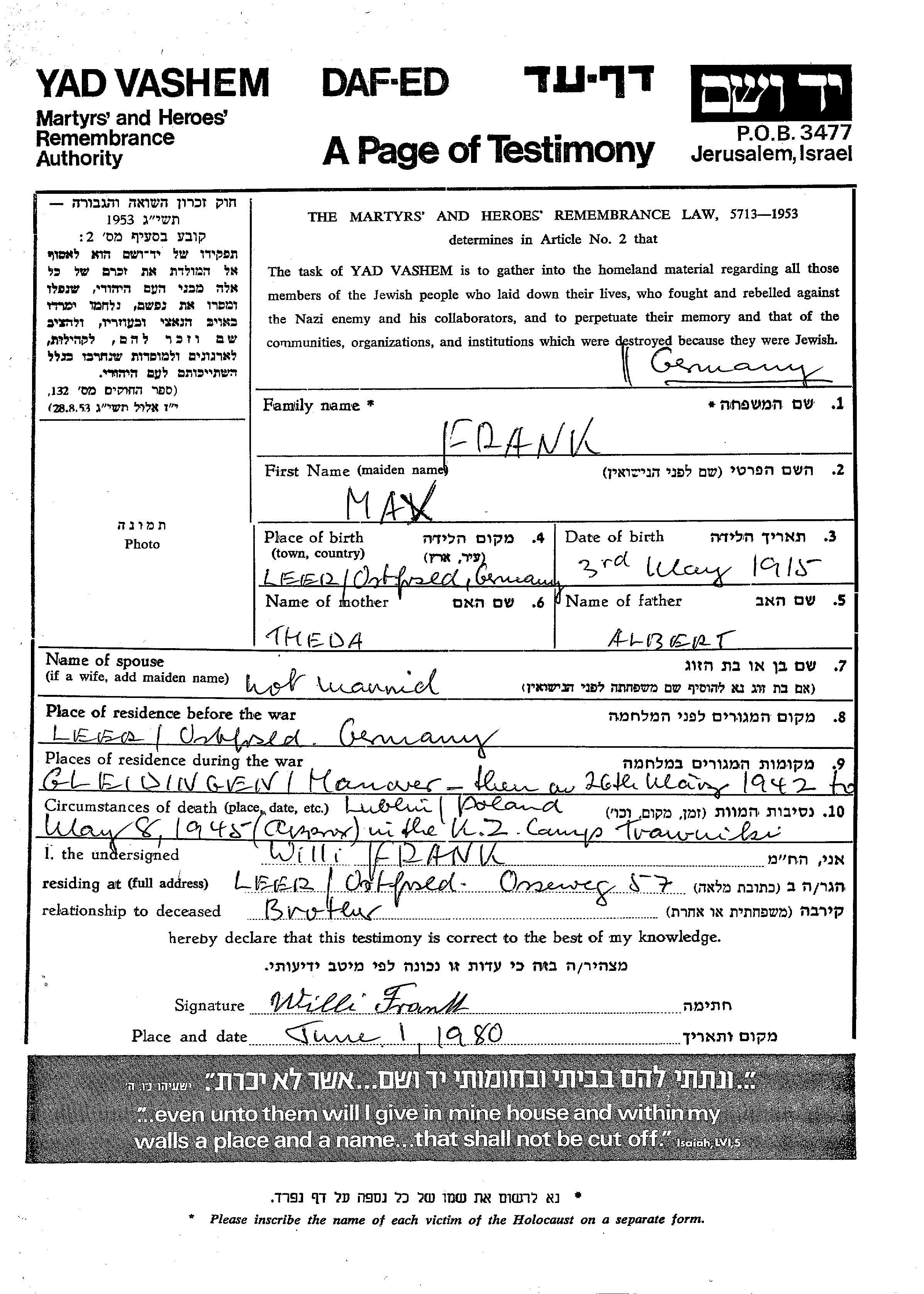 Max wurde in der Schoah ermordet. Todesort: Trawniki, Polen im Jahr 1945.