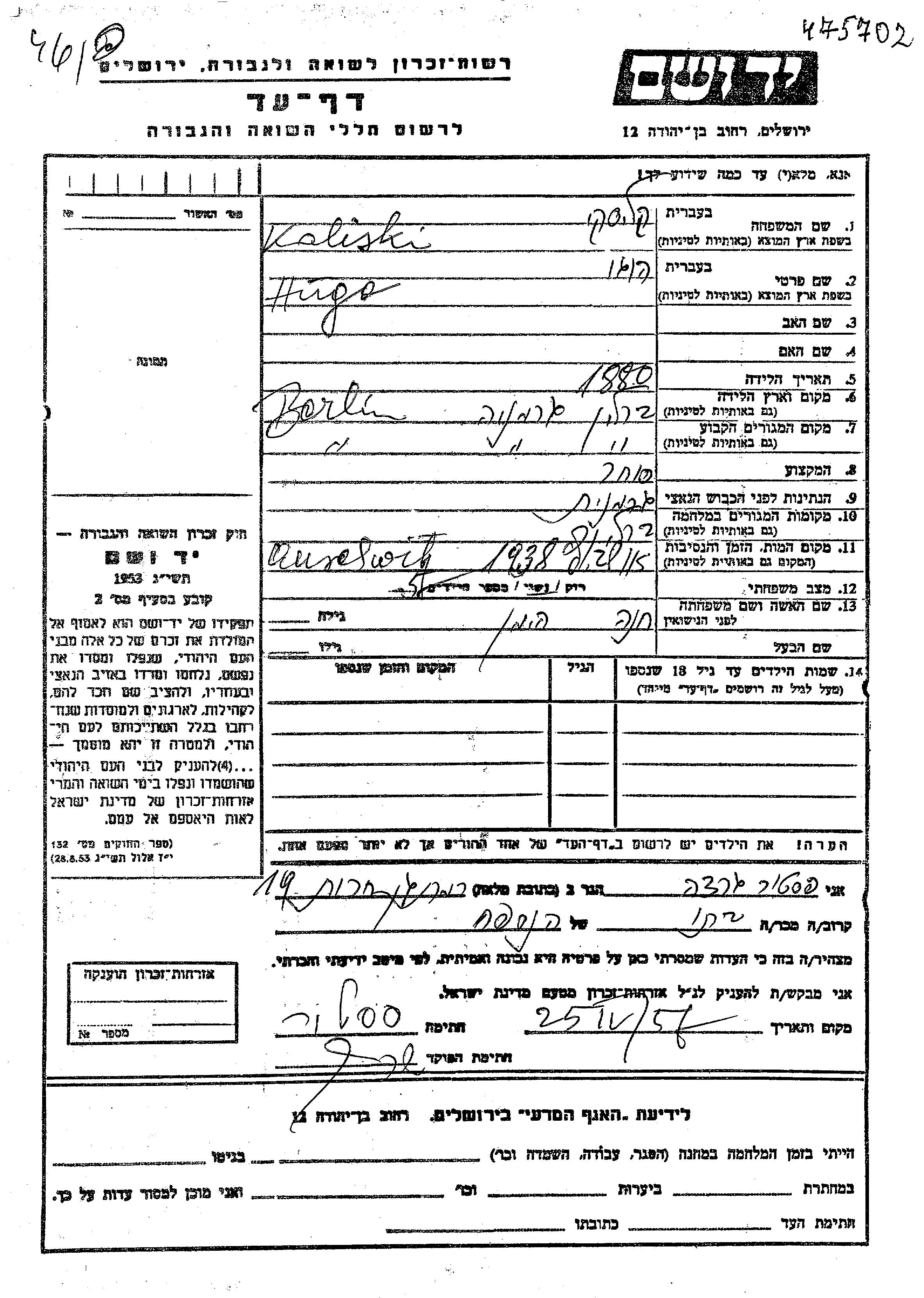 Hugo Kaliski wurde im Jahr 1880 in Berlin, Deutsches Reich geboren. Er war Kaufmann/-frau und mit Khana, geb. Heiman Verheiratet. Vor dem Zweiten Weltkrieg lebte er in Berlin, Deutsches Reich. Während des Krieges war er in Berlin, Deutsches Reich.