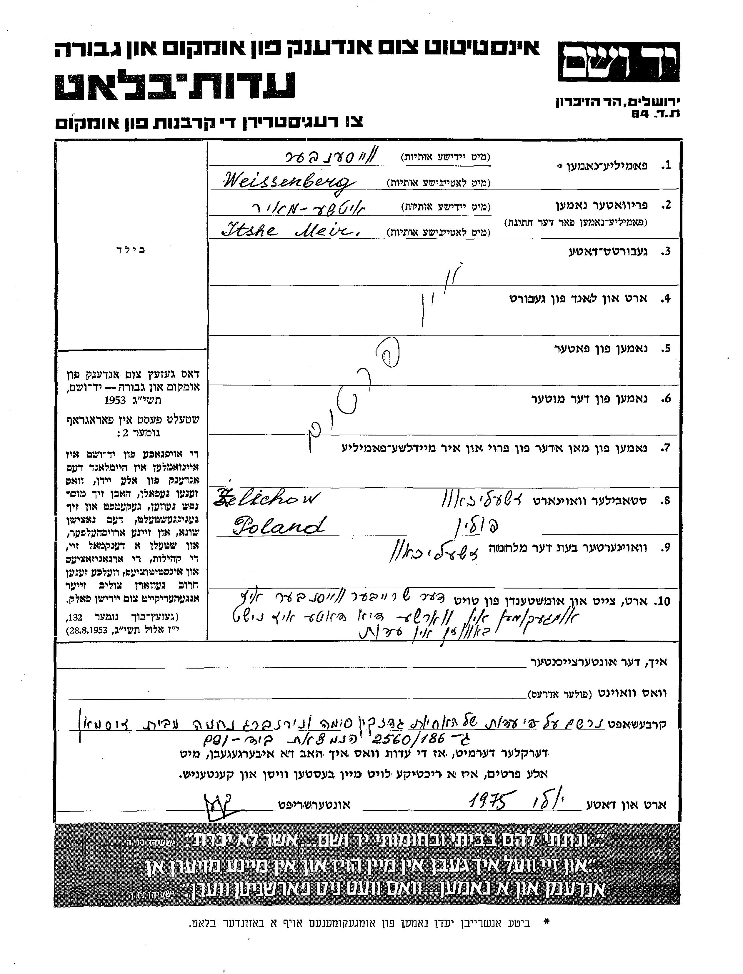 Meir Iche Weissenberg. Vor dem Zweiten Weltkrieg lebte er in Zelichow, Polen. Während des Krieges war er in Zelichow, Polen.