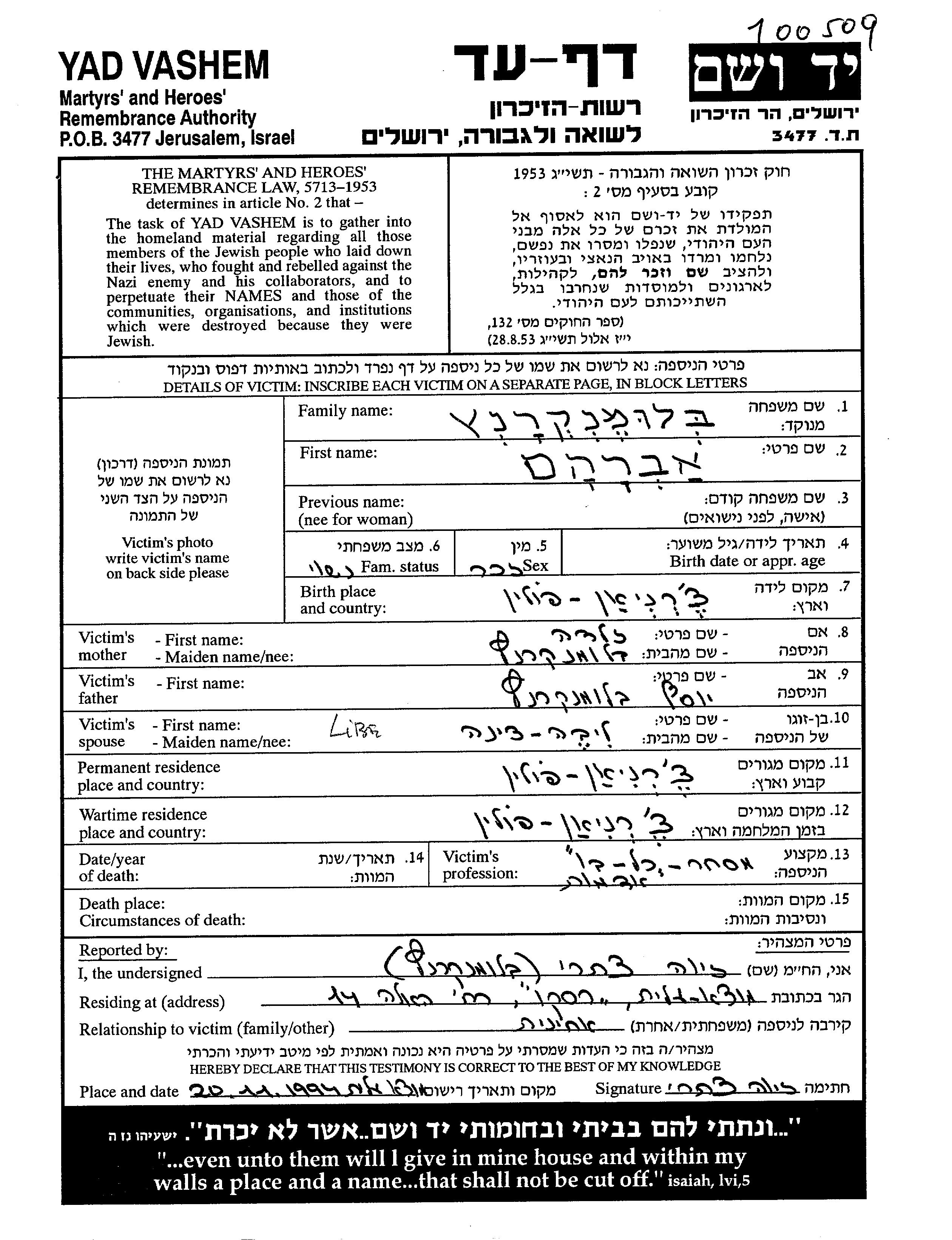 Avraham Blumenkrantz wurde in Czernin, Polen geboren. Er war der Sohn von Yosef und Zelda Dina. Er war Kaufmann/-frau und mit Liba Dina, geb. Libe Verheiratet. Vor dem Zweiten Weltkrieg lebte er in Czernin, Polen. Während des Krieges war er in Czernin, Polen.