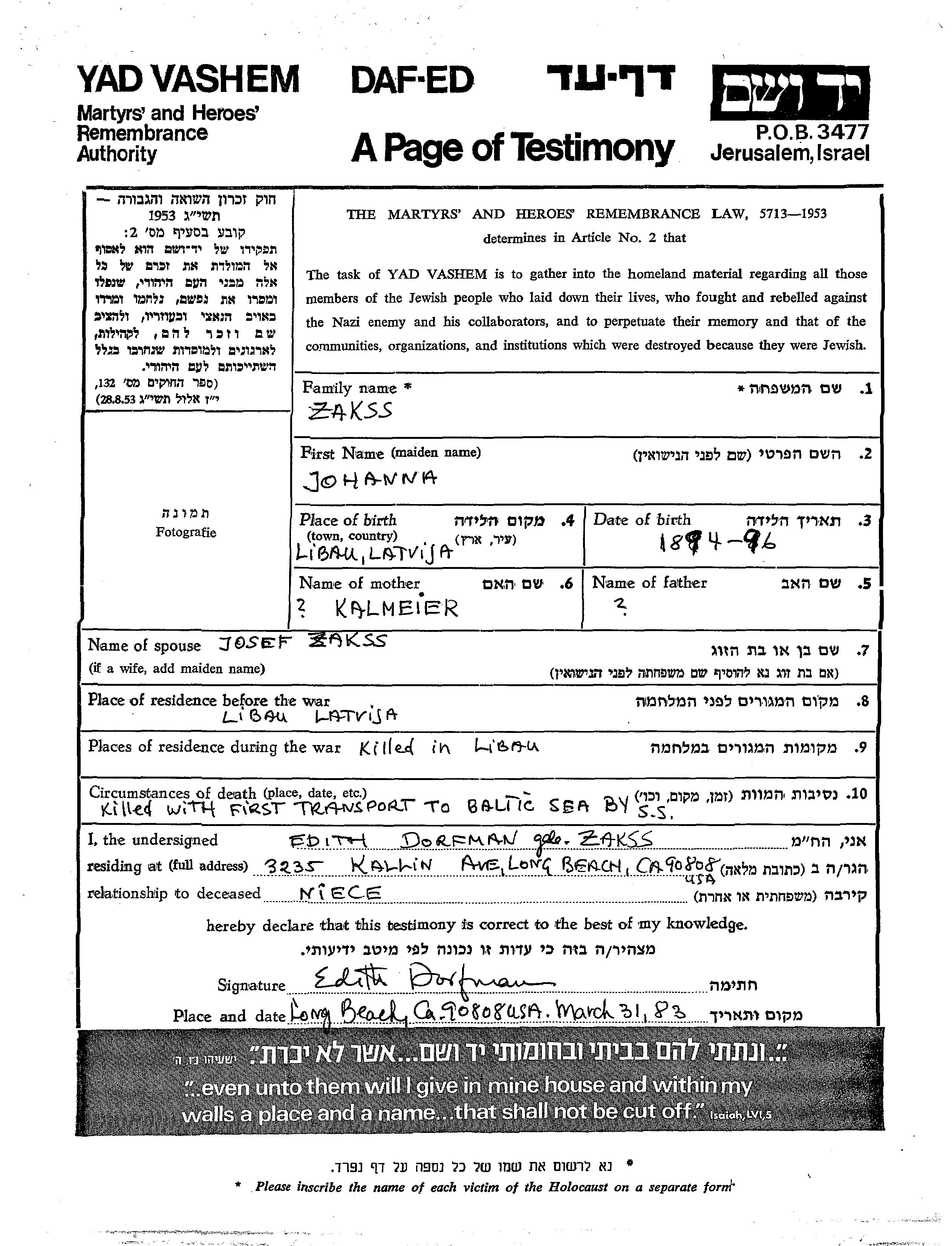 Johanna Zakss, geb. Kalmeier wurde im Jahr 1894 in Libau, Lettland geboren. Vor dem Zweiten Weltkrieg lebte sie in Libau, Lettland.