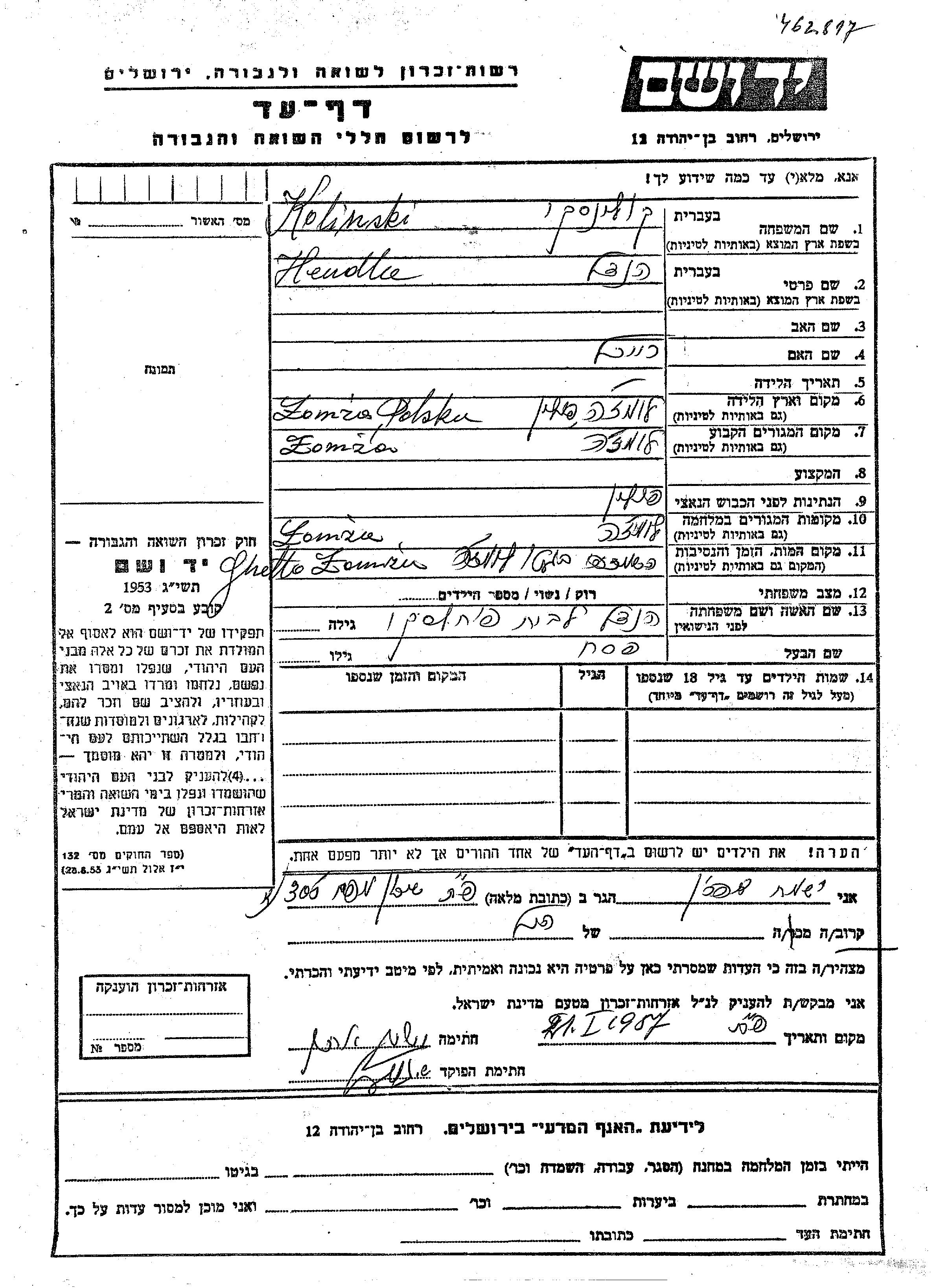 Hendle Hendel Kolinski, geb. Pukhalski wurde in Łomża, Polen geboren. Sie war die Tochter von Rakhel. Sie war mit Pesakh Verheiratet. Vor dem Zweiten Weltkrieg lebte sie in Łomża, Polen. Während des Krieges war sie in Łomża, Polen.