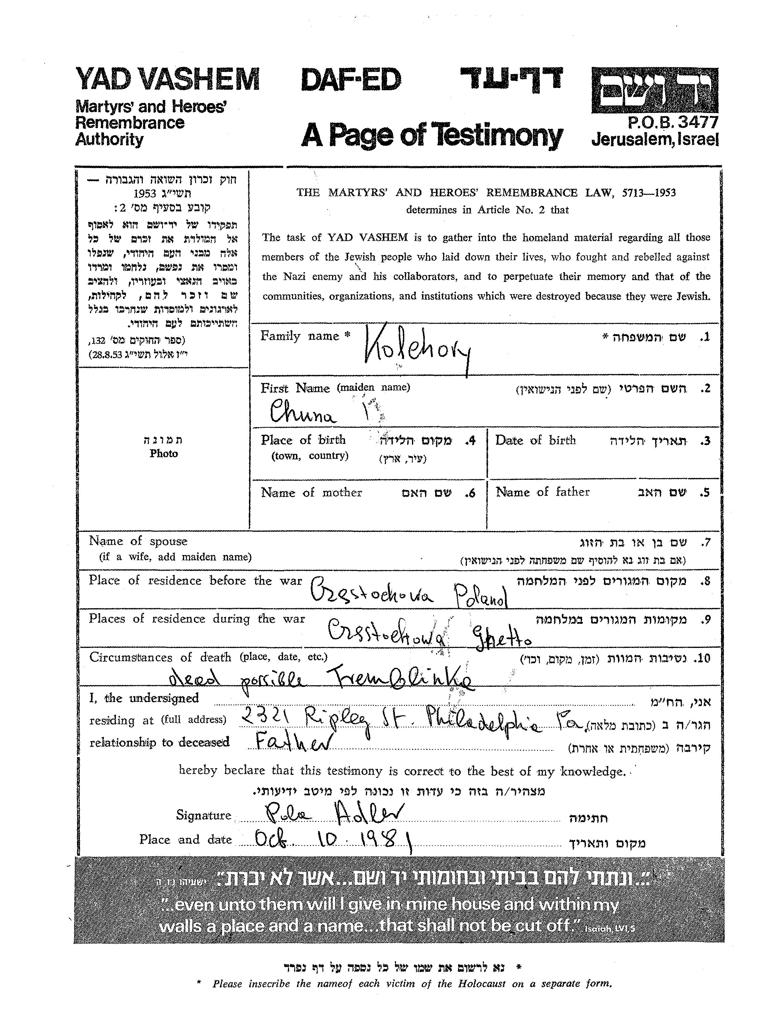 Chuna Kolchory. Vor dem Zweiten Weltkrieg lebte er in Czestochowa, Polen. Während des Krieges war er in Czestochowa, Polen.