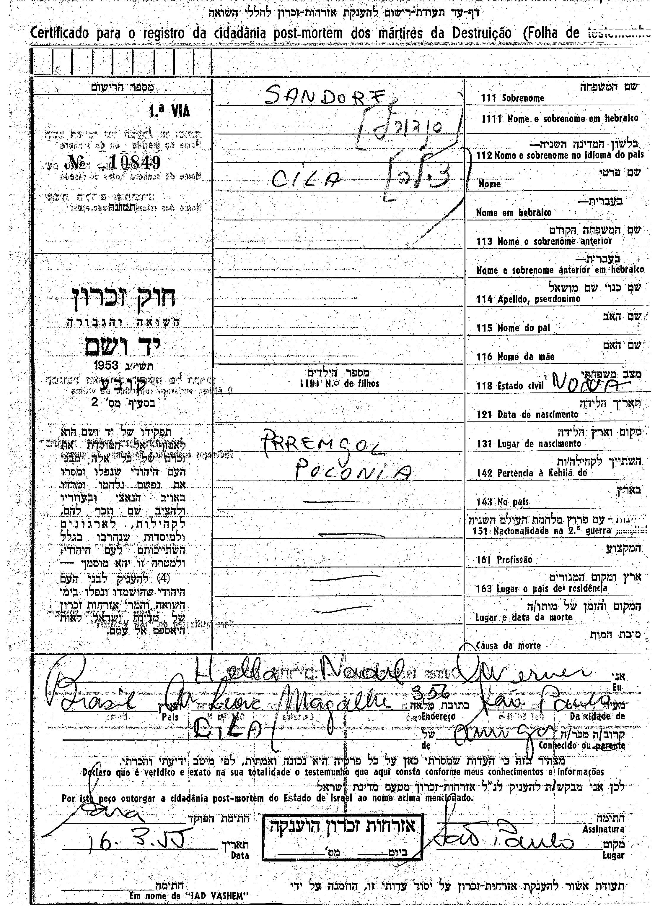 Cila Sandorf wurde in Przygola, Polen geboren. Vor dem Zweiten Weltkrieg lebte sie in Polen.