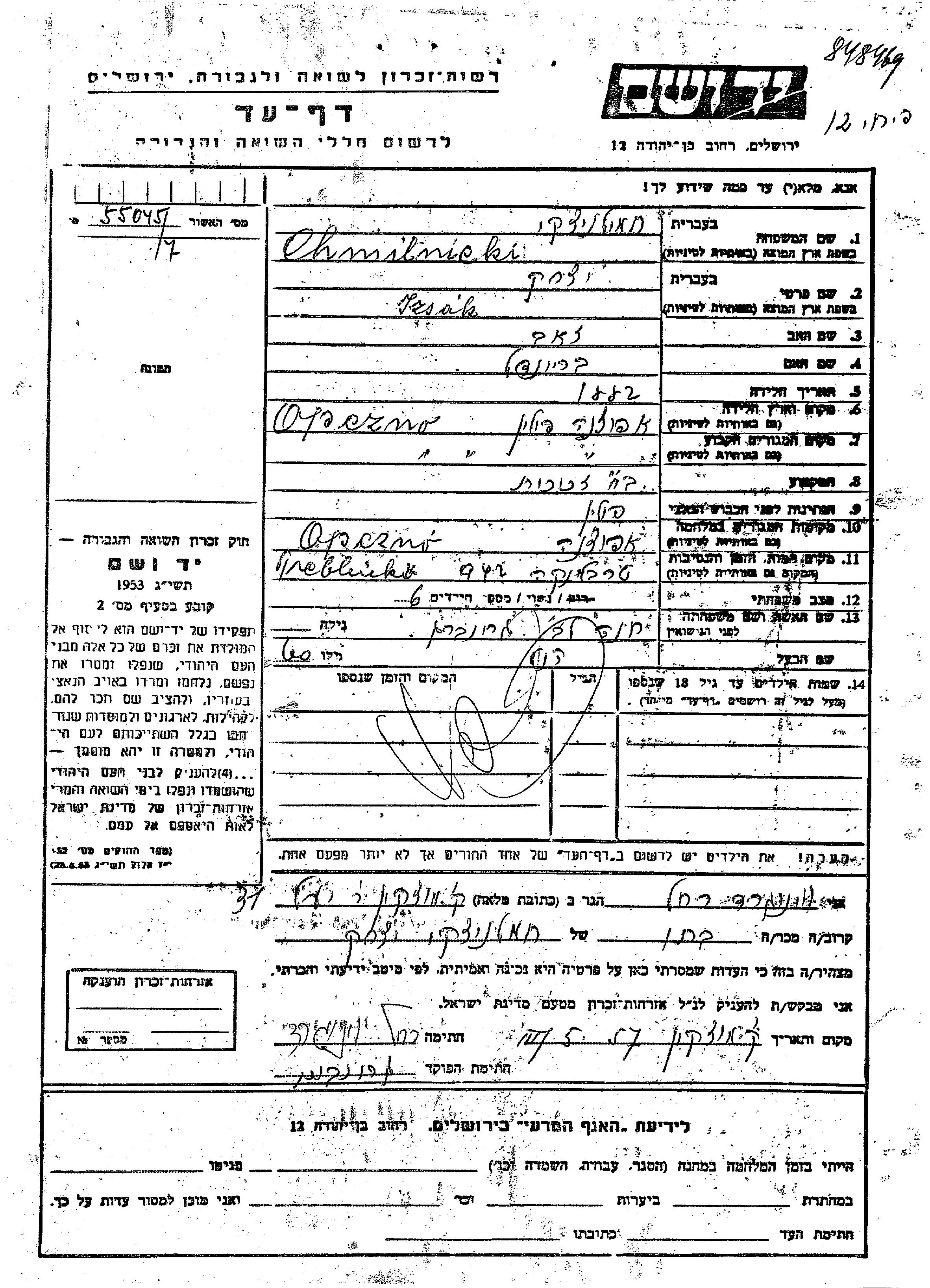 Izsak Chmilnicki wurde im Jahr 1882 in Opoczne, Polen geboren. Er war der Sohn von Zeev und Braindel. Er war mit Khana, geb. Grinberg Verheiratet. Vor dem Zweiten Weltkrieg lebte er in Opoczne, Polen. Während des Krieges war er in Opoczne, Polen.