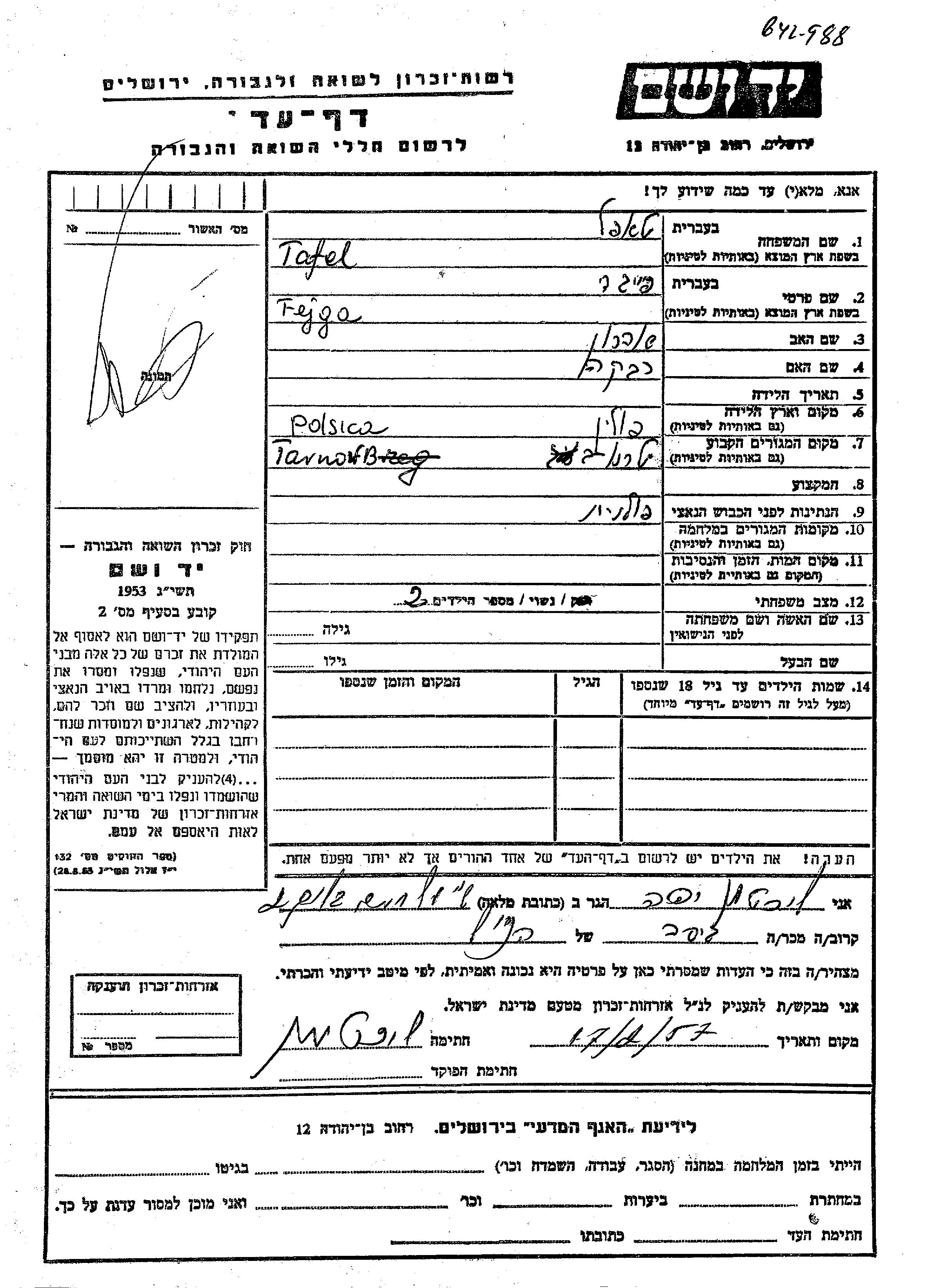 Fejga Tafel Tepel wurde in Tarnow, Polen geboren. Sie war die Tochter von Aharon und Rivka. Sie war Verheiratet. Vor dem Zweiten Weltkrieg lebte sie in Tarnow, Polen.