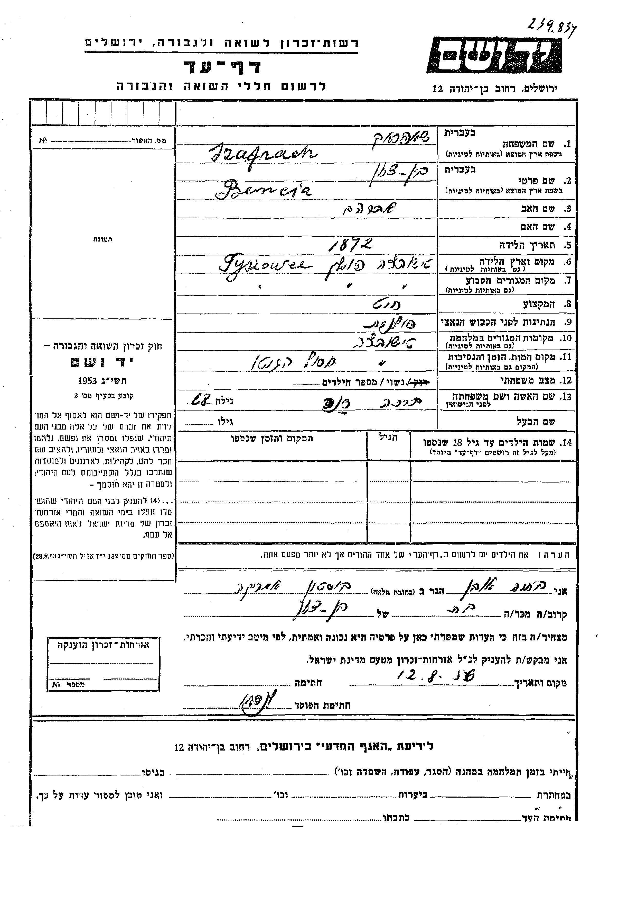 Bencia Szafrach wurde im Jahr 1872 in Tyszowce, Polen geboren. Er war der Sohn von Avraham. Er war Schneider und mit Brakha, geb. Zand Verheiratet. Vor dem Zweiten Weltkrieg lebte er in Tyszowce, Polen. Während des Krieges war er in Tyszowce, Polen.