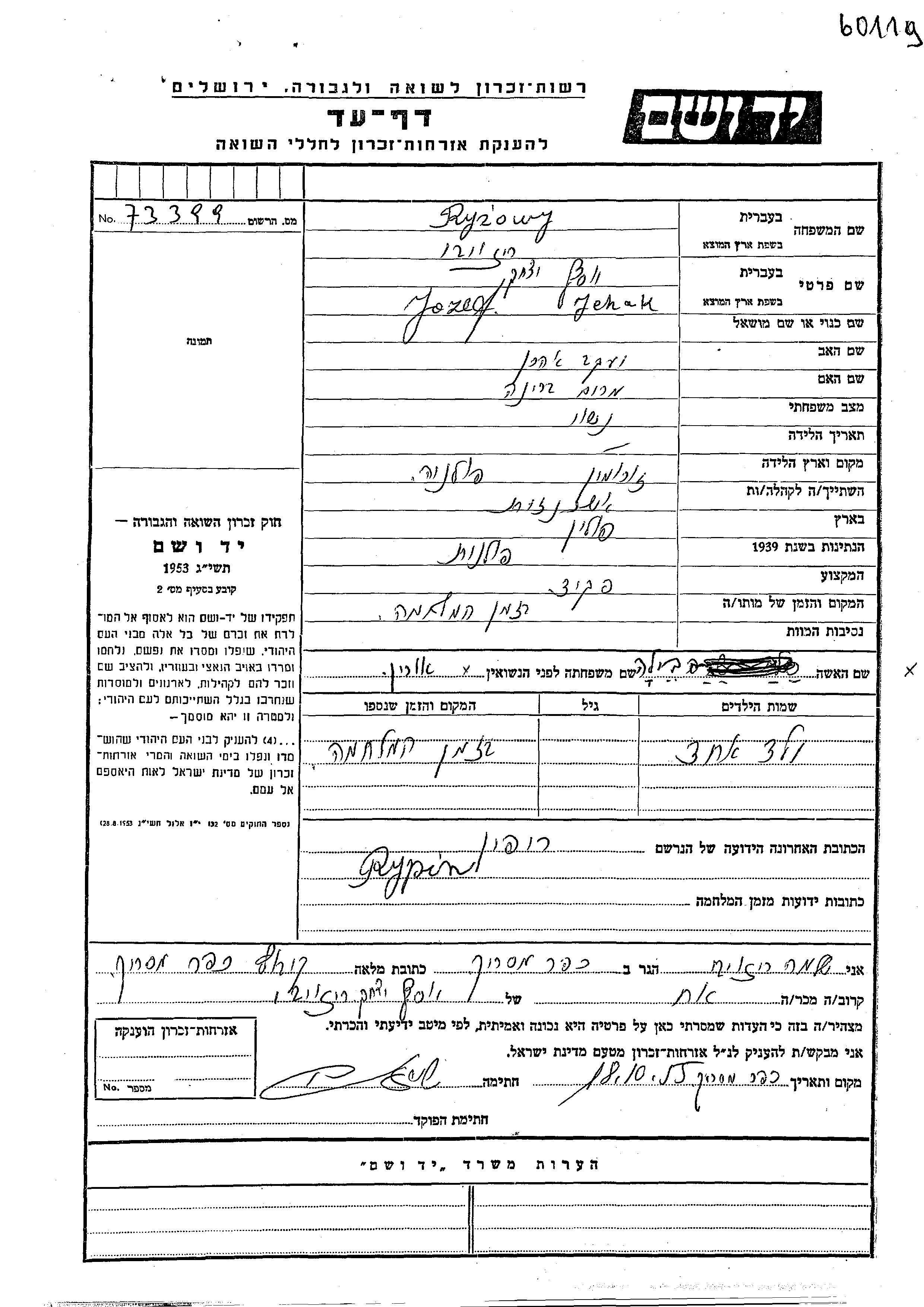 Josef Jchak Ryzowy wurde in Zuromin, Polen geboren. Er war der Sohn von Yaakov Aharon und Miriam Breina. Er war Angestellte/-r und mit Bila, geb. Urin Verheiratet. Vor dem Zweiten Weltkrieg lebte er in Rypin, Polen. Während des Krieges war er in Rypin, Polen.