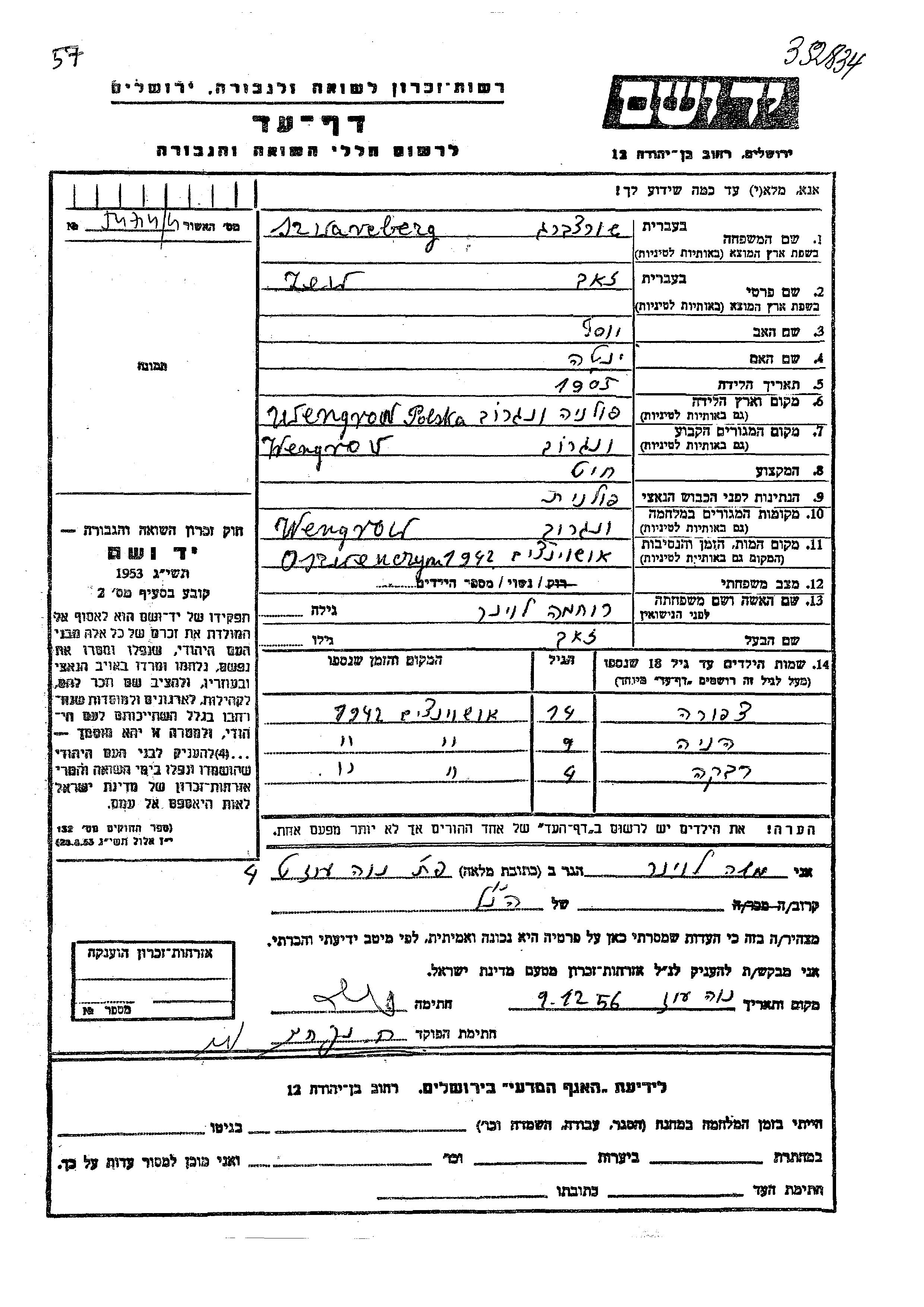 Zew Szwarcberg wurde im Jahr 1905 in Wengrow, Polen geboren. Er war der Sohn von Yosef und Yenta. Er war Schneider und mit Rukhama, geb. Leviner Verheiratet. Vor dem Zweiten Weltkrieg lebte er in Wengrow, Polen. Während des Krieges war er in Wengrow, Polen.