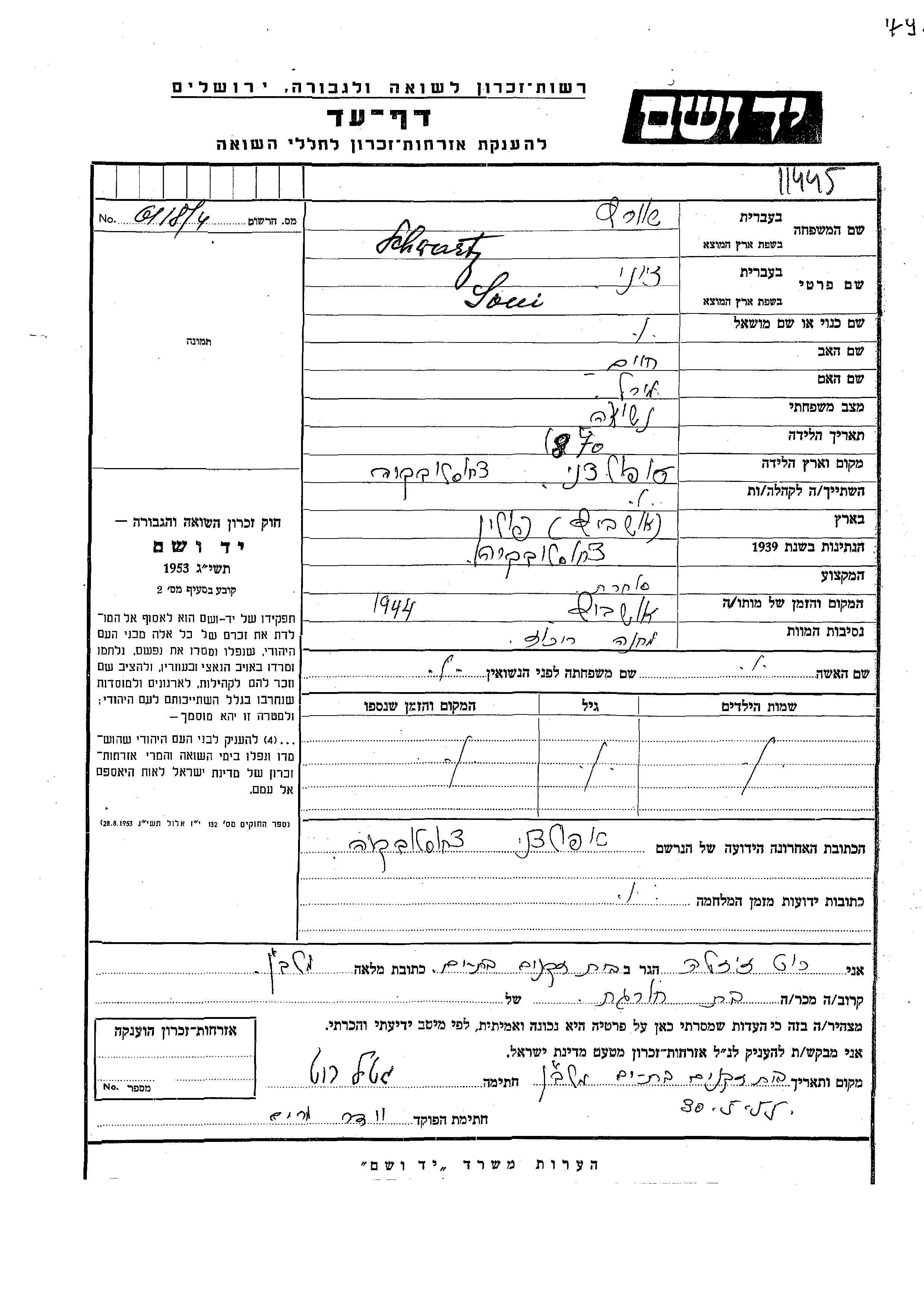 Jani Zheini Scwartz wurde im Jahr 1870 in Topolcany, Tschechoslowakei geboren. Sie war die Tochter von Khaim und Mirl. Sie war Kaufmann/-frau. Vor dem Zweiten Weltkrieg lebte sie in Topolcany, Tschechoslowakei. Während des Krieges war sie in Topolcany, Tschechoslowakei.