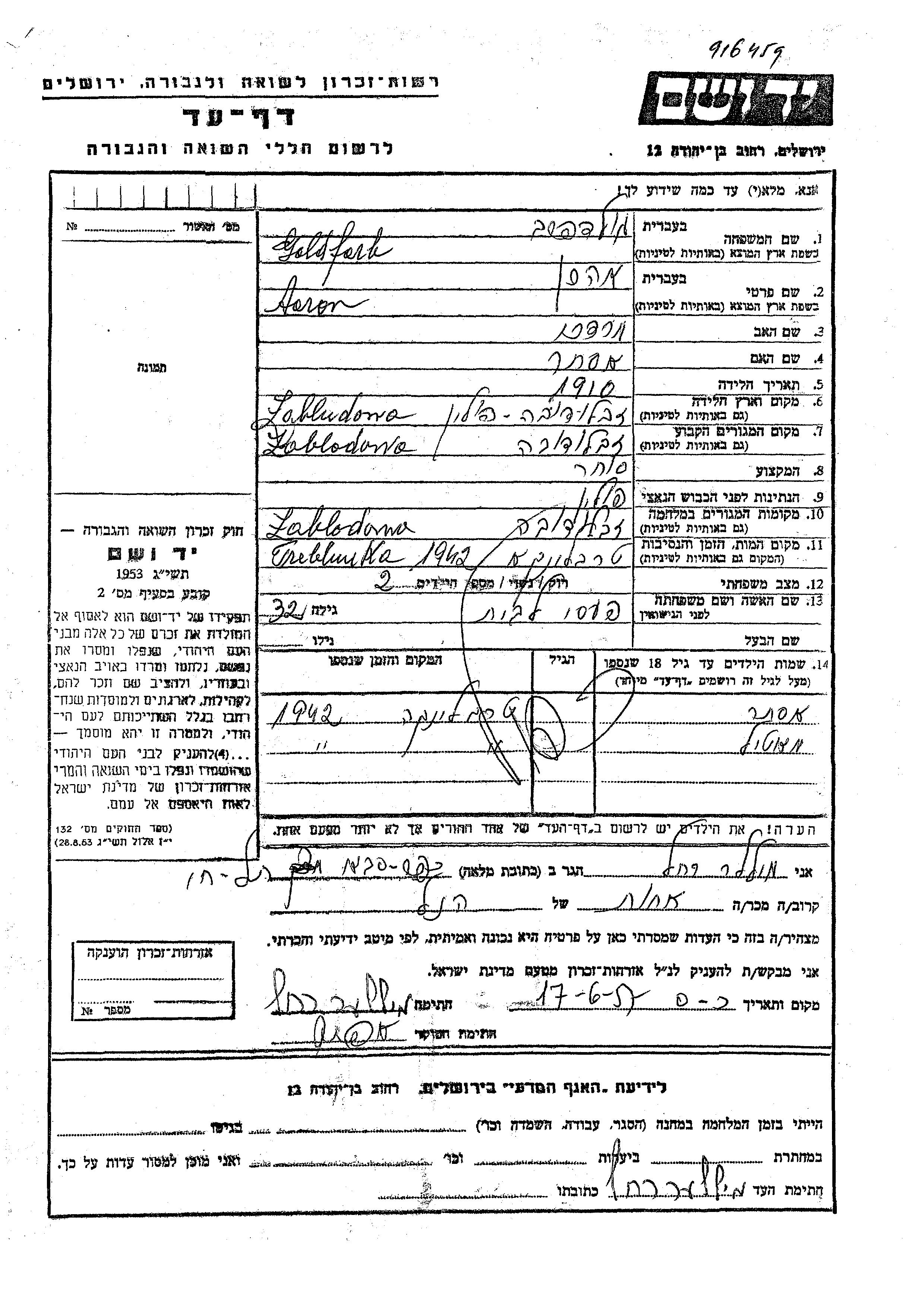 Goldfarb Aaron 1910 Zabludowe, Polen Gedenkblatt