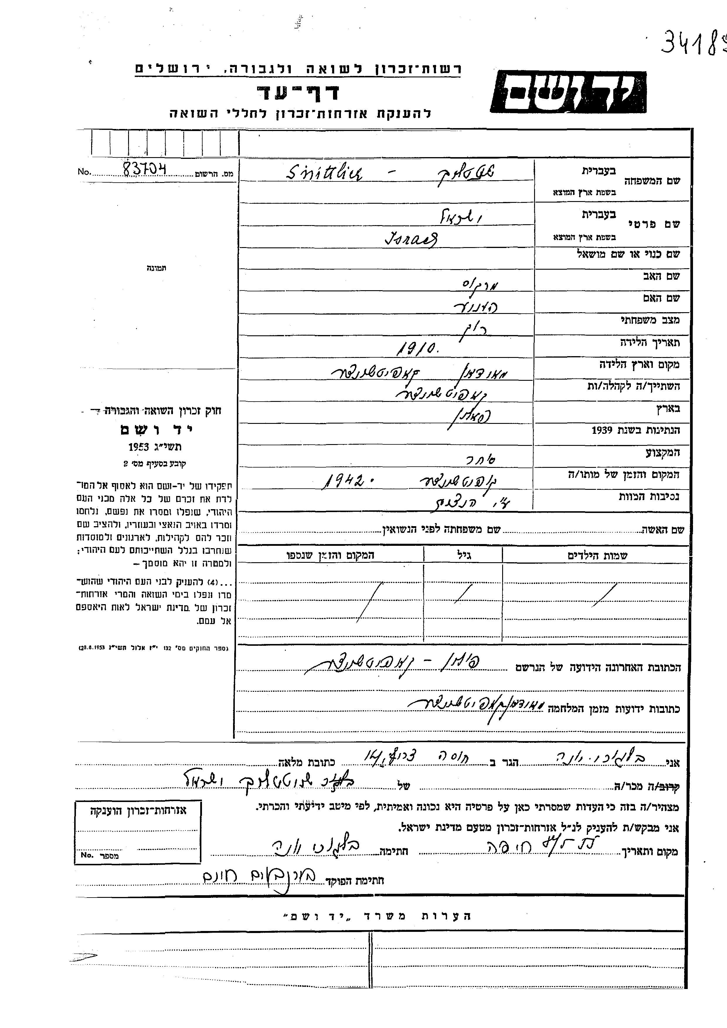 Israel Snittlich Shantir wurde im Jahr 1910 in Majdan, Polen geboren. Er war der Sohn von Markus und Henie. Er war Kaufmann/-frau und Ledig. Vor dem Zweiten Weltkrieg lebte er in Majdan, Polen. Während des Krieges war er in Majdan, Polen.
