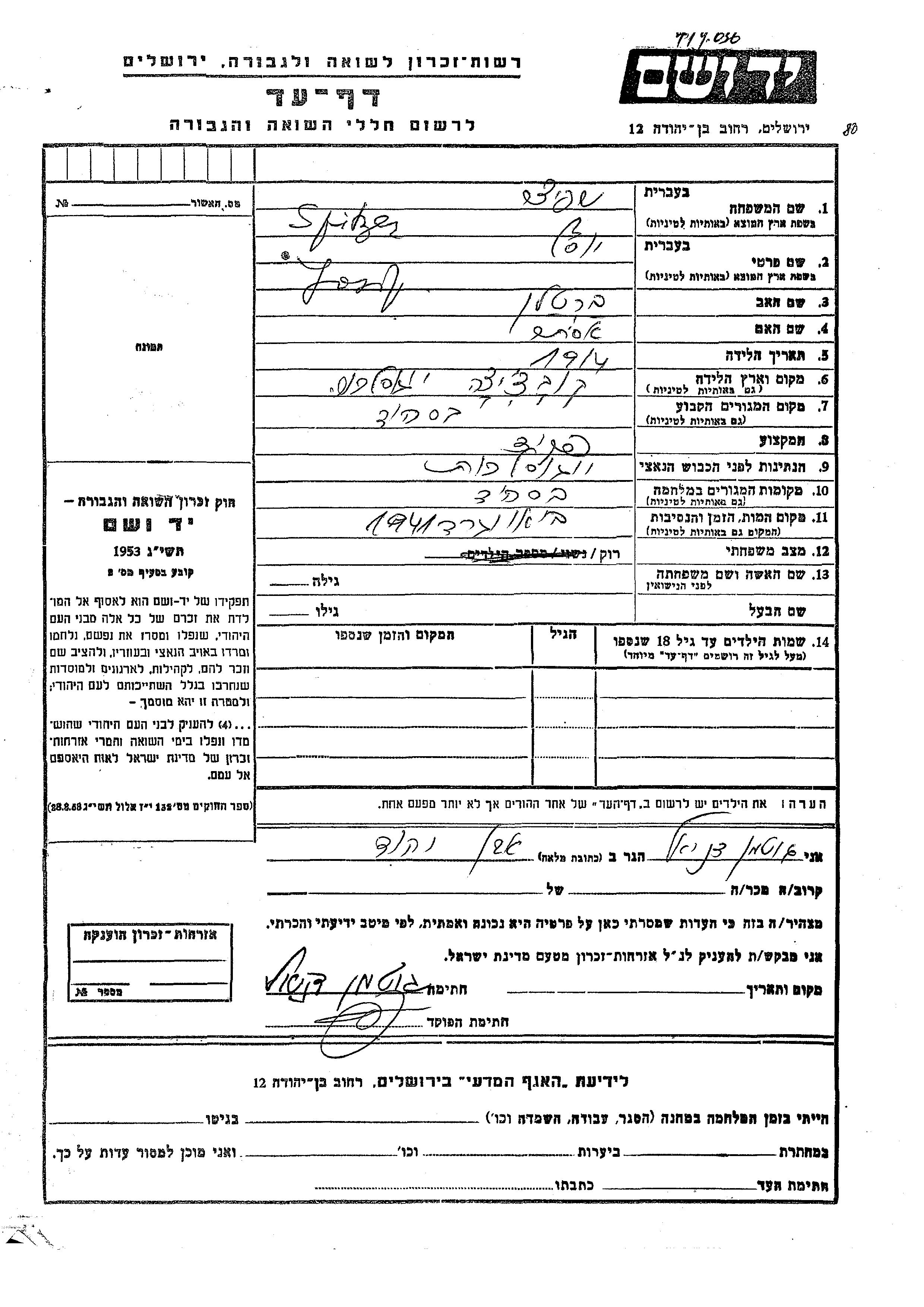 Yosef Spicer wurde im Jahr 1914 in Kovacica, Jugoslawien geboren. Er war der Sohn von Bertalan und Ester. Er war Angestellte/-r und Ledig. Vor dem Zweiten Weltkrieg lebte er in Sid, Jugoslawien. Während des Krieges war er in Sid, Jugoslawien.