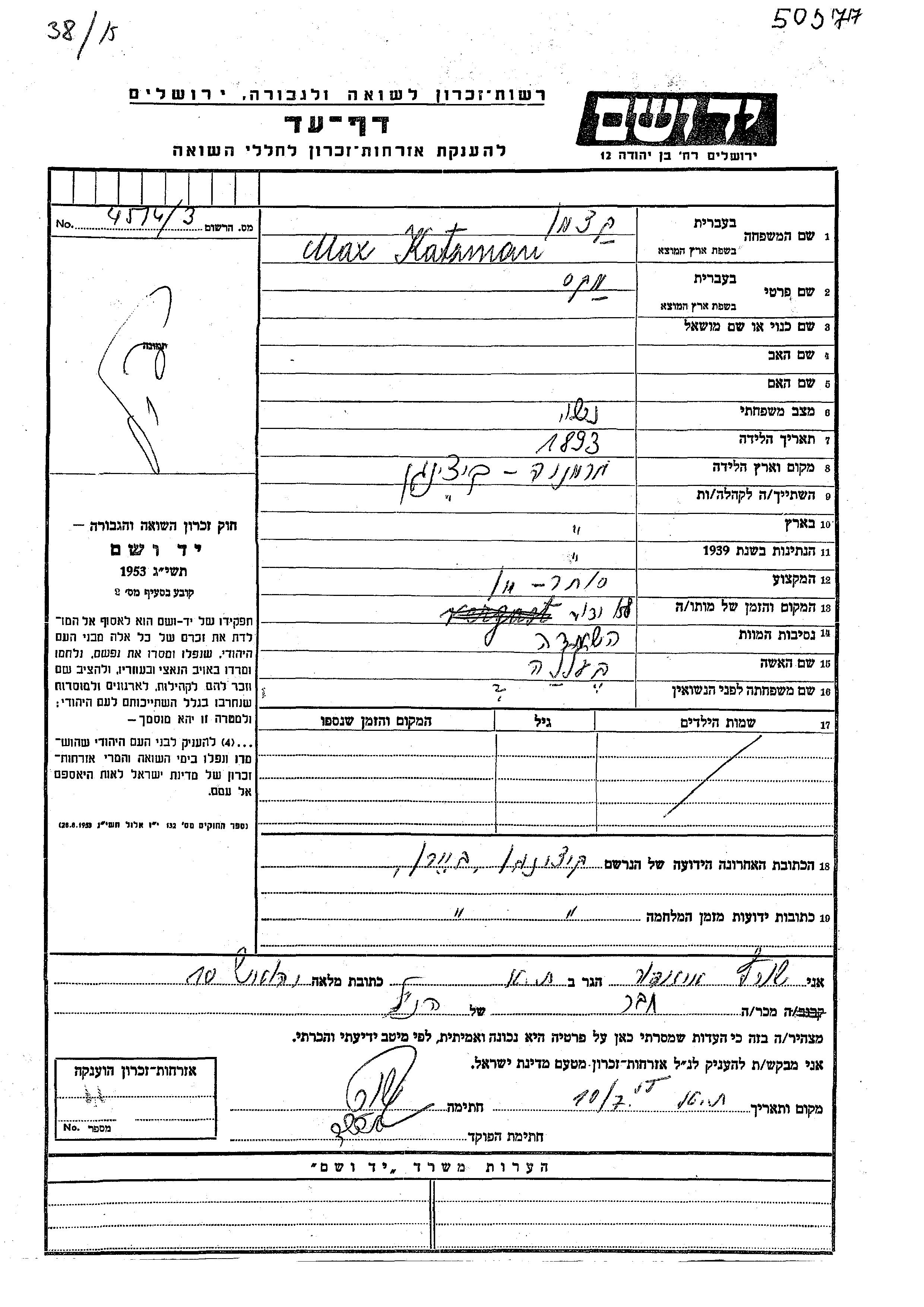 Max Katzman wurde im Jahr 1893 in Kitzingen, Deutsches Reich geboren. Er war Weinhändler und mit Bela Verheiratet. Vor dem Zweiten Weltkrieg lebte er in Kitzingen, Deutsches Reich. Während des Krieges war er in Kitzingen, Deutsches Reich.