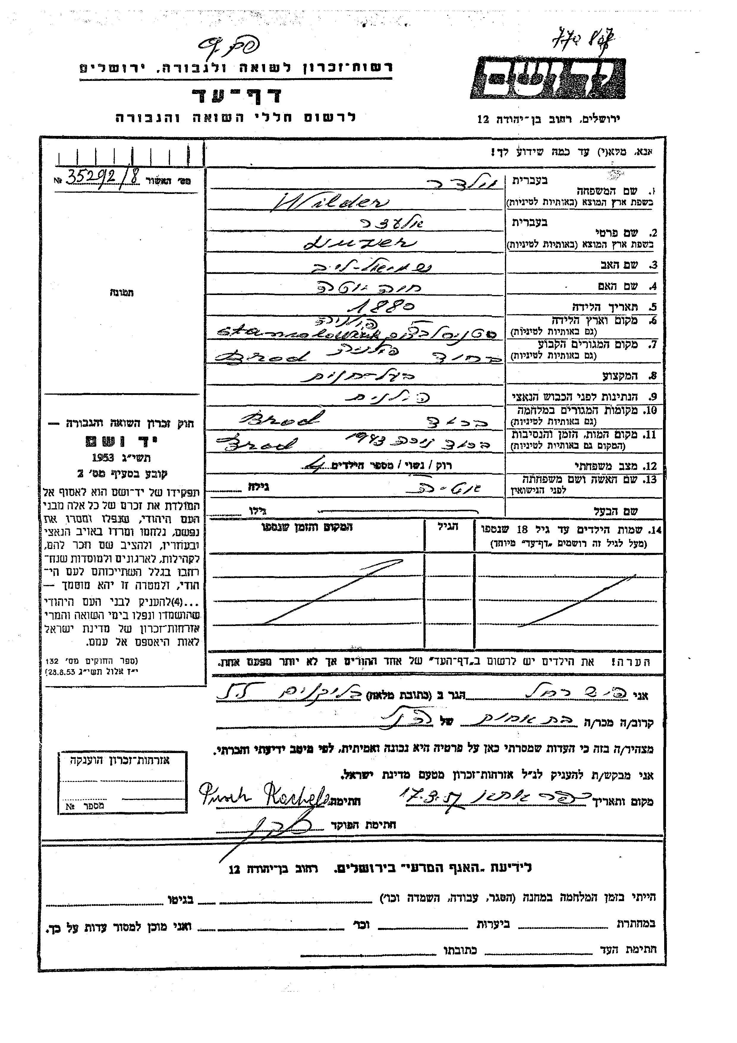 Luzer Wilder wurde im Jahr 1880 in Stanislawczyk, Polen geboren. Er war der Sohn von Shmuel Leib und Khava Yuta. Er war Ladenbesitzer/-in und mit Etya Verheiratet. Vor dem Zweiten Weltkrieg lebte er in Brod, Polen. Während des Krieges war er in Brod, Polen.
