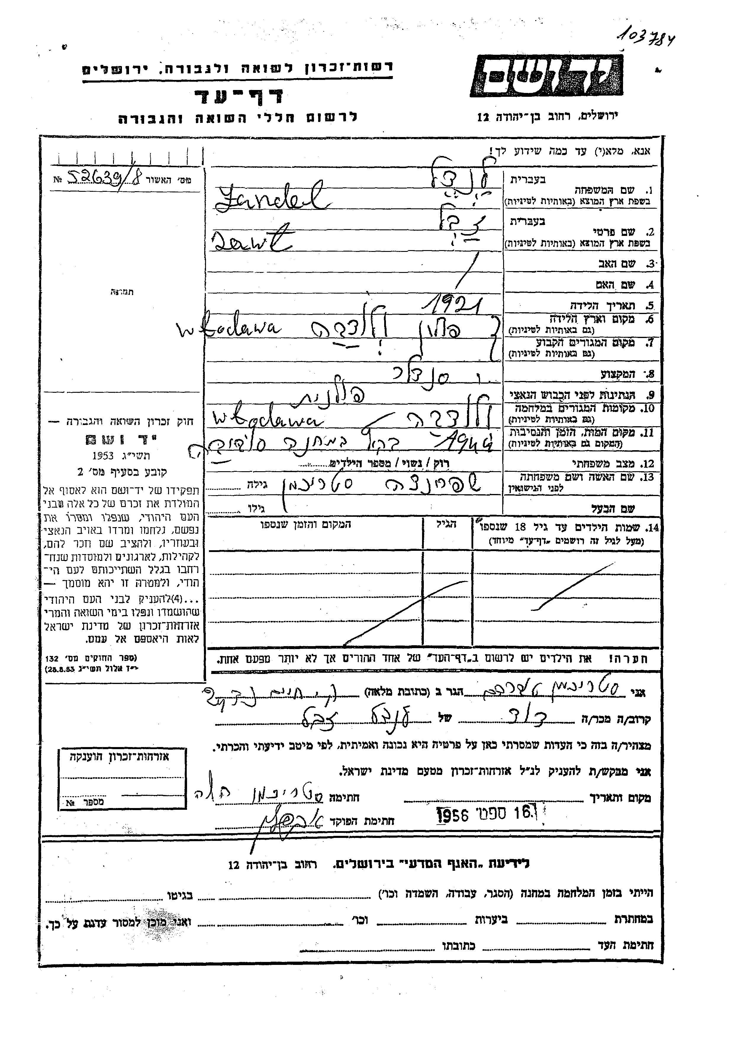 Zawl Landel wurde im Jahr 1921 in Wlodawa, Polen geboren. Er war Schuster/-in. Vor dem Zweiten Weltkrieg lebte er in Wlodawa, Polen. Während des Krieges war er in Wlodawa, Polen.