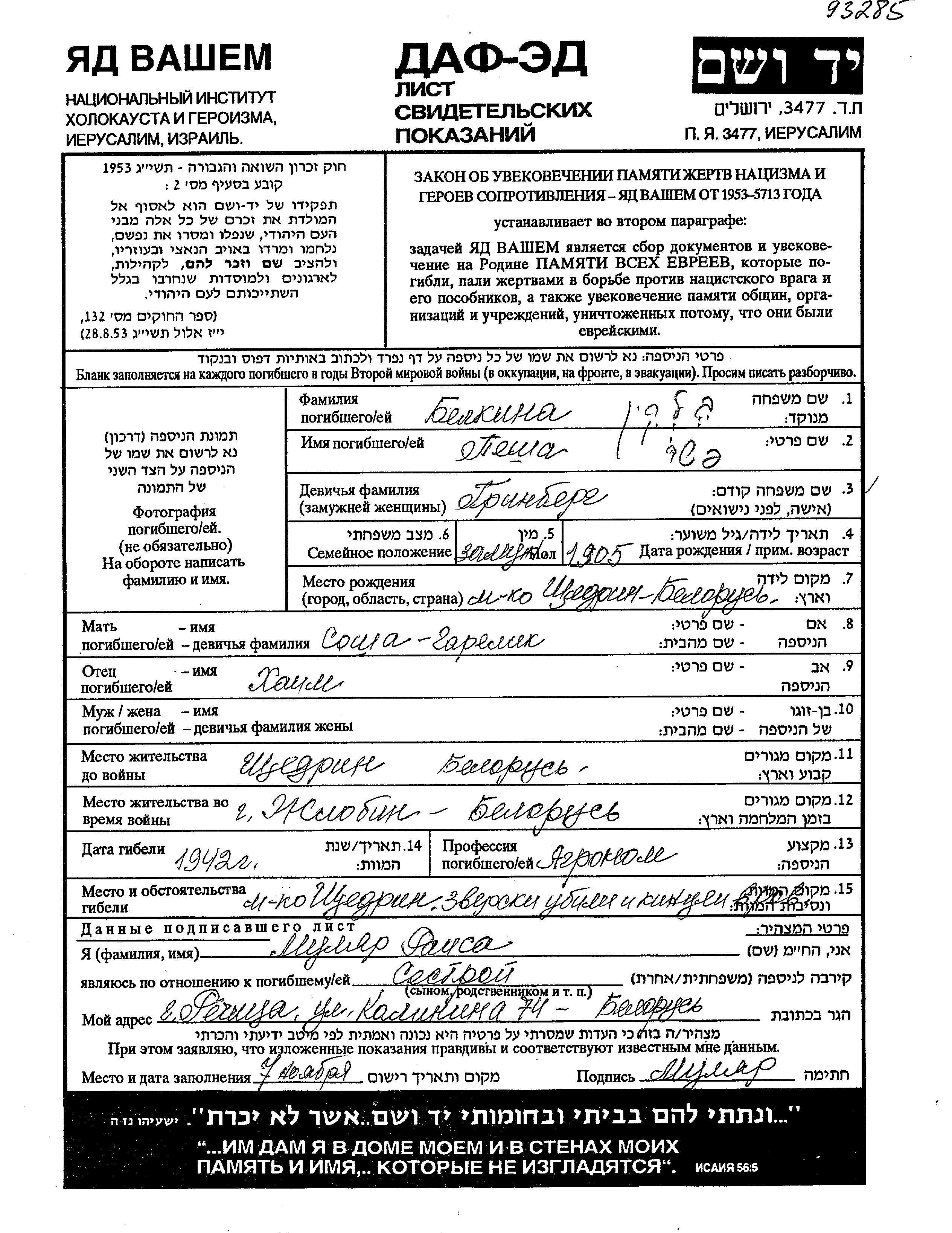 Pesha Belkin, geb. Grinberg wurde im Jahr 1905 in Shchedrin, Weißrussland (UdSSR) geboren. Sie war die Tochter von Khaim und Sasha, geb. Gorelik. Sie war Studierter landwirt und Verheiratet. Vor dem Zweiten Weltkrieg lebte sie in Shchedrin, Weißrussland (UdSSR). Während des Krieges war sie in Shchedrin, Weißrussland (UdSSR).