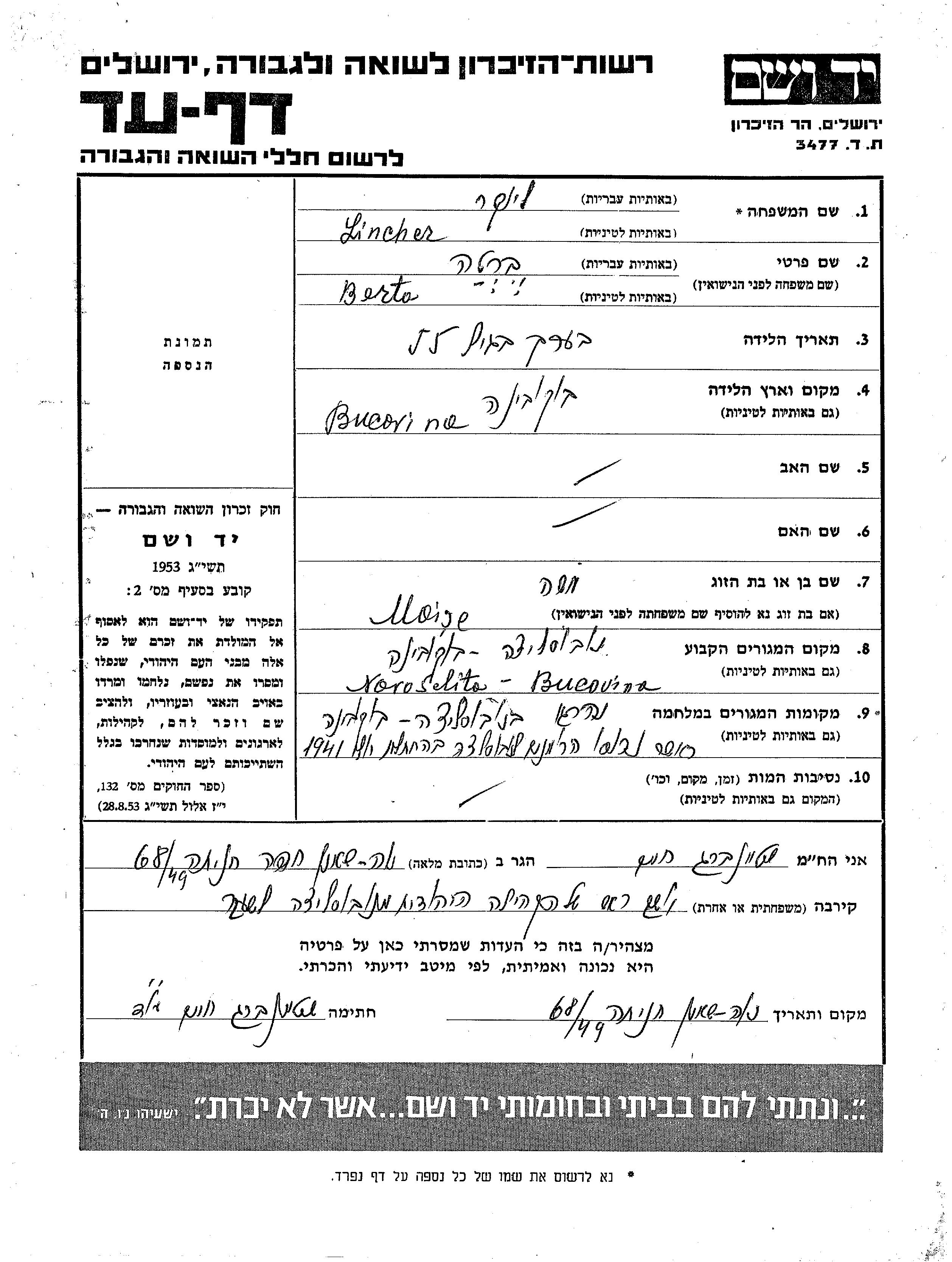 Berta Lincher wurde in Bukovina, Rumänien geboren. Vor dem Zweiten Weltkrieg lebte sie in Novoselita, Rumänien. Während des Krieges war sie in Novoselita, Rumänien.