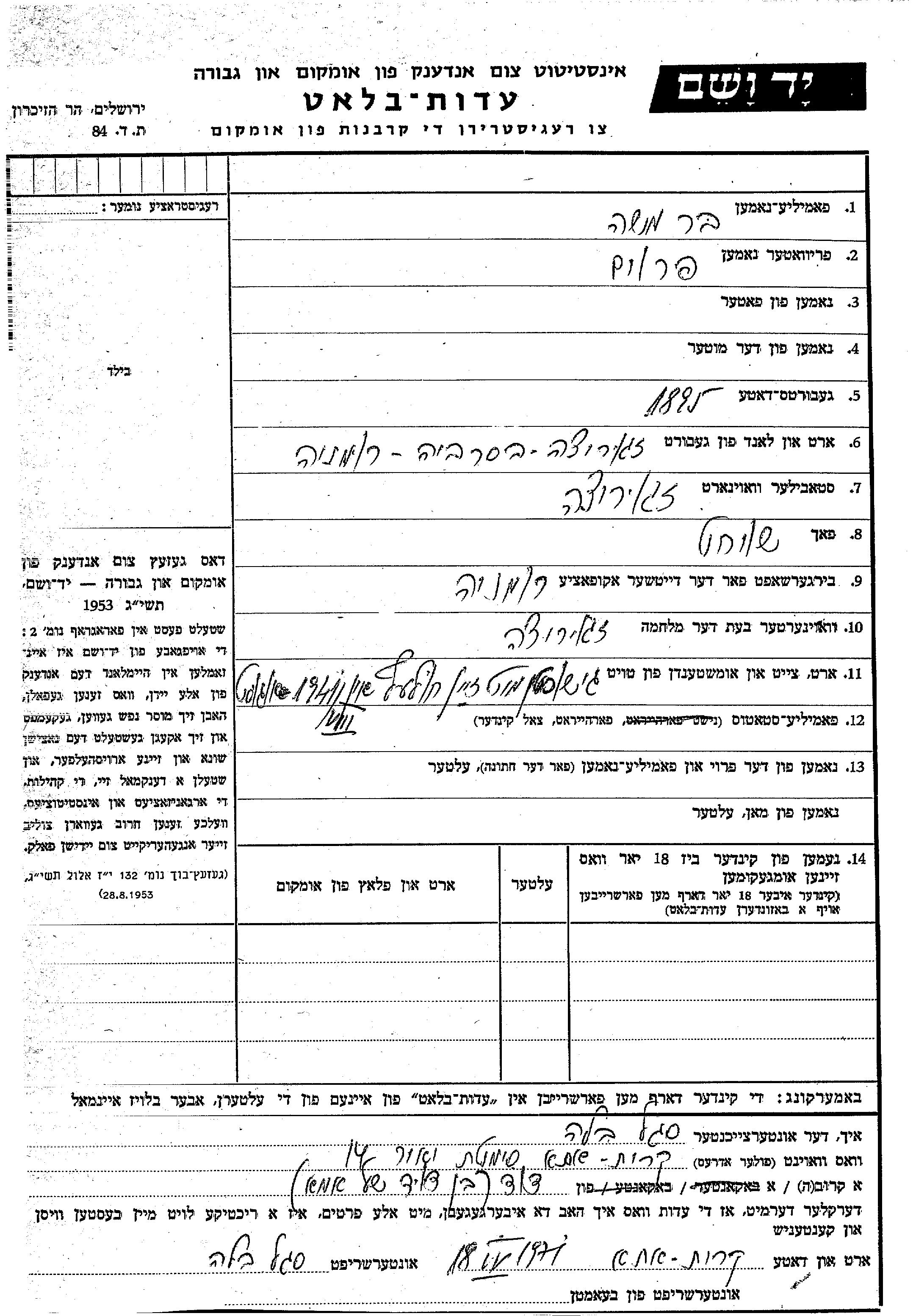 Froim Bar Moshe wurde im Jahr 1895 in Zgurita, Rumänien geboren. Er war Schächter. Vor dem Zweiten Weltkrieg lebte er in Zgurita, Rumänien. Während des Krieges war er in Zgurita, Rumänien.