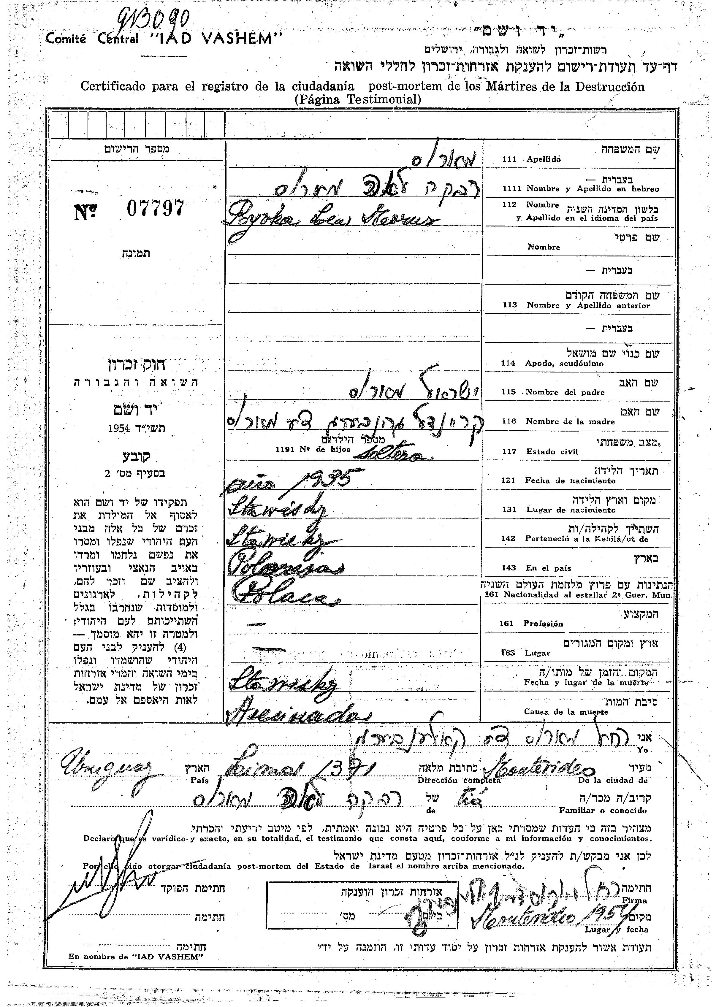 Ryvka Lea Meorus wurde im Jahr 1935 in Stawiski, Polen geboren. Sie war die Tochter von Yisrael und Kreindel.