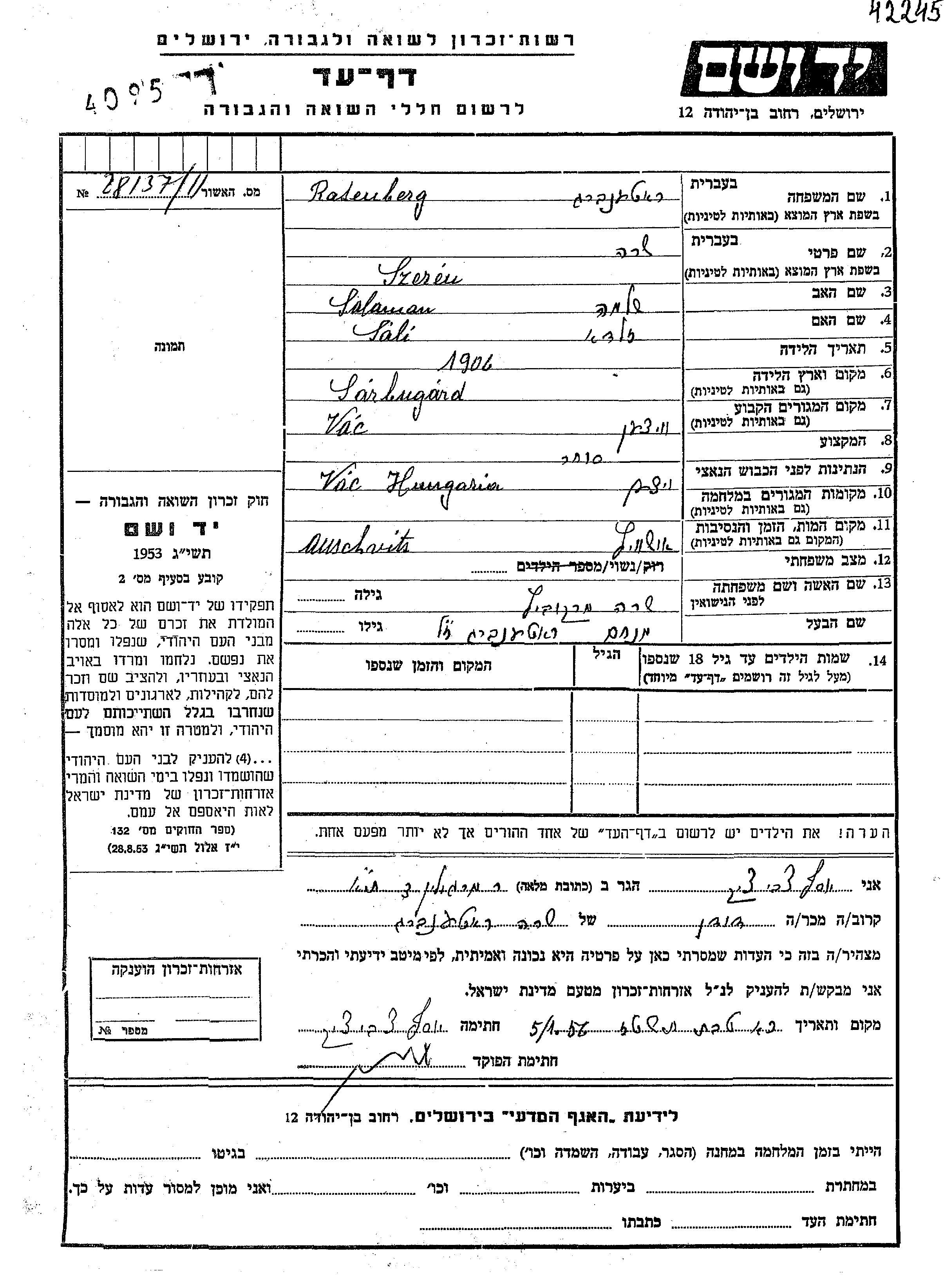 Szeren Rotenberg Ratenberg, geb. Markovitz wurde im Jahr 1906 in Sarbogard, Ungarn geboren. Sie war die Tochter von Salamon und Zelda Sali. Sie war Kaufmann/-frau und mit Menakhem Verheiratet. Vor dem Zweiten Weltkrieg lebte sie in Vac, Ungarn. Während des Krieges war sie in Vac, Ungarn.