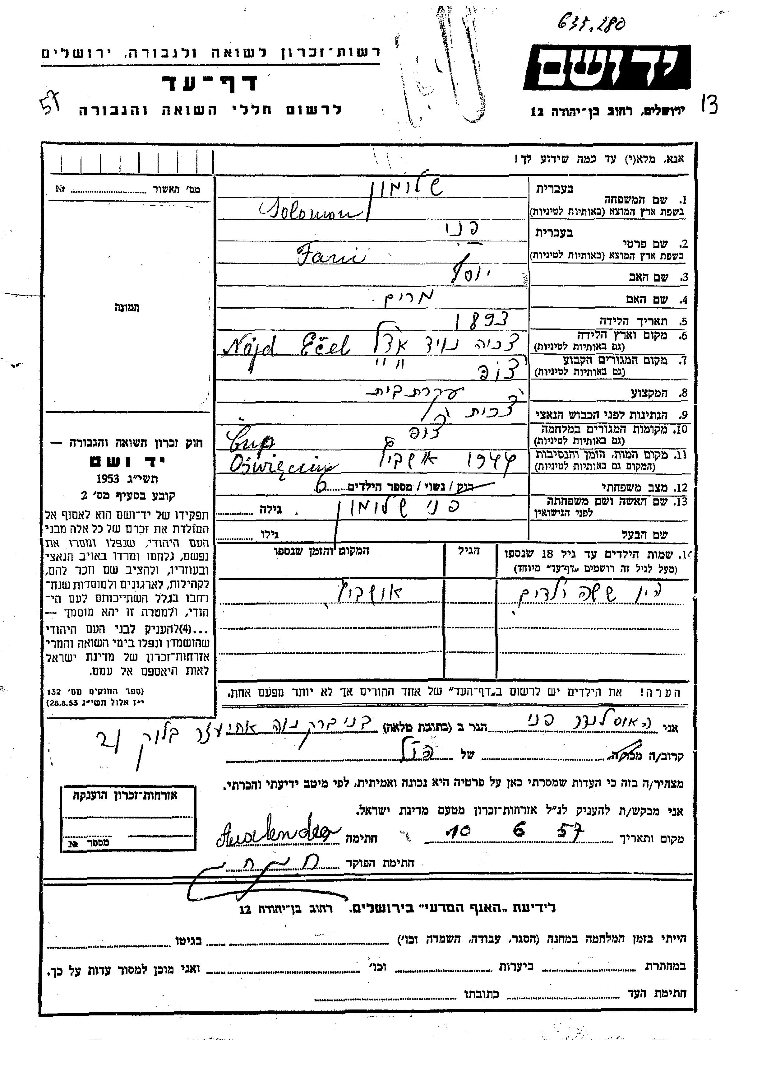 Fani Solomon Shalomon wurde im Jahr 1893 in Nagyecsed, Ungarn geboren. Sie war die Tochter von Yosef und Miriam. Sie war Hausfrau und Verheiratet. Vor dem Zweiten Weltkrieg lebte sie in Nagyecsed, Ungarn. Während des Krieges war sie in Cop, Tschechoslowakei.