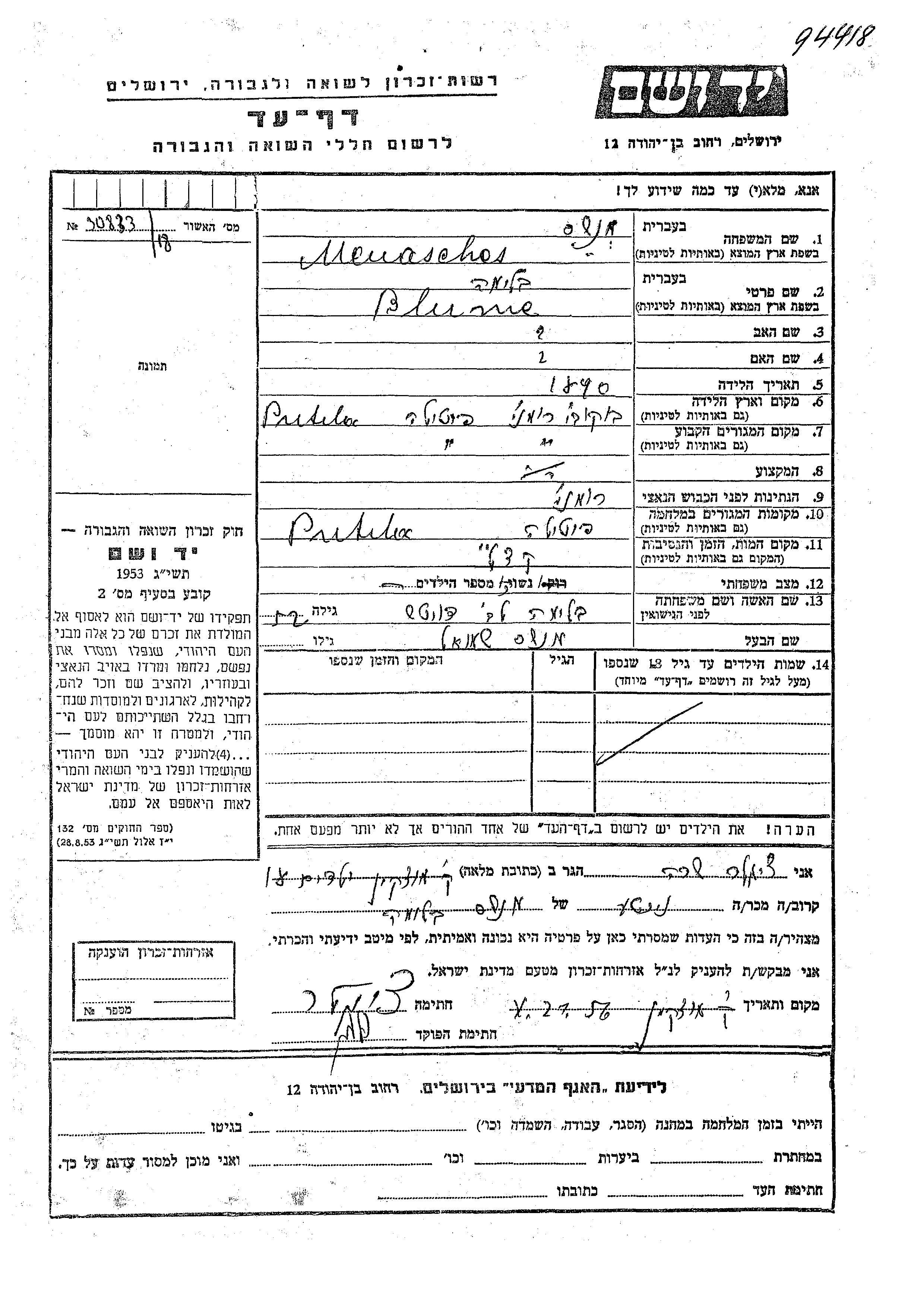 Bluma Menasches, geb. Deutsch wurde im Jahr 1890 in Putila, Rumänien geboren. Sie war mit Shmuel Verheiratet. Vor dem Zweiten Weltkrieg lebte sie in Putila, Rumänien. Während des Krieges war sie in Putila, Rumänien.