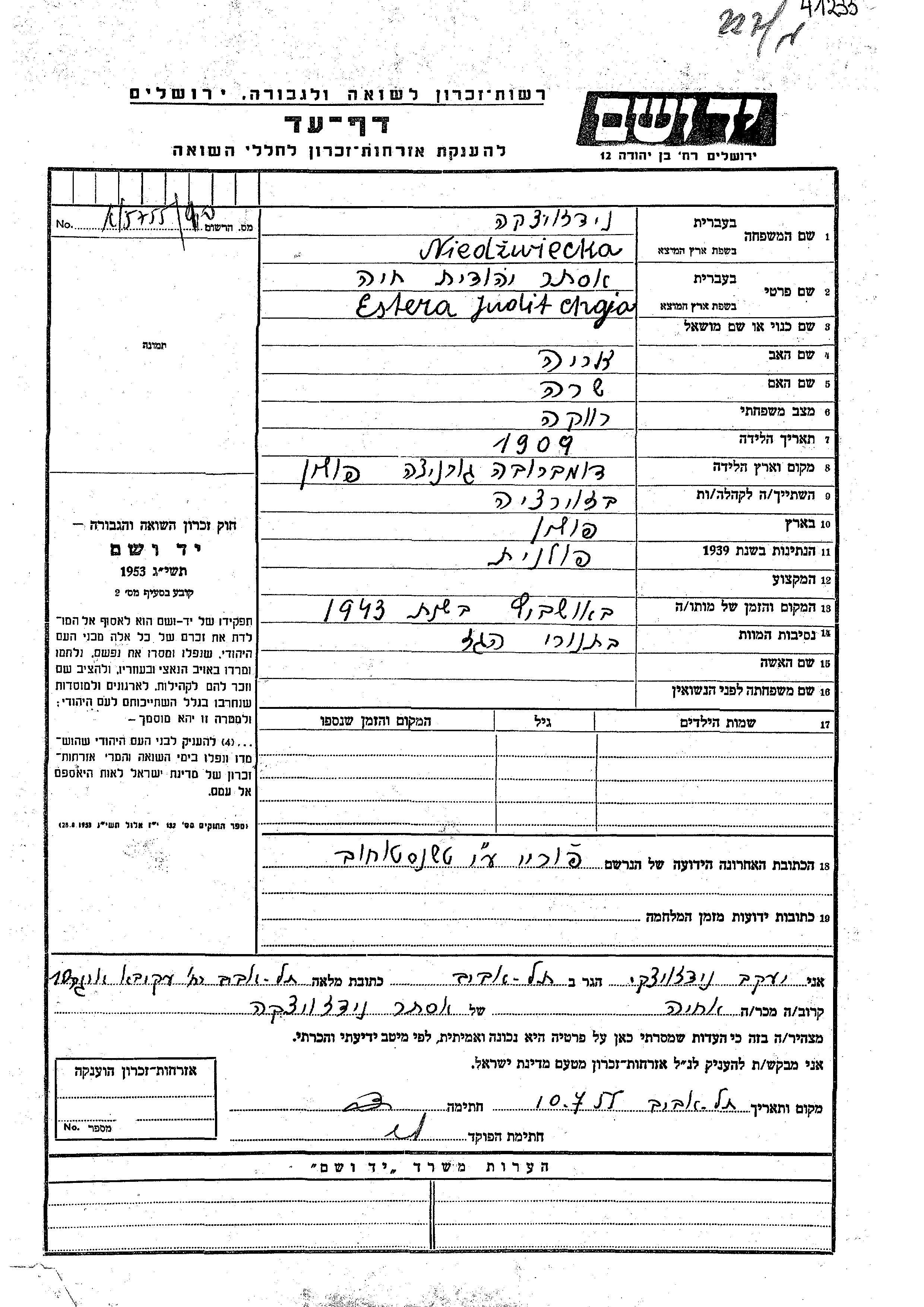 Estera Judit Chaja Niedzwiecka wurde im Jahr 1909 in Dabrowa Gornicza, Polen geboren. Sie war die Tochter von Arie und Sara. Sie war Ledig. Vor dem Zweiten Weltkrieg lebte sie in Zawierce, Polen. Während des Krieges war sie in Czestochow, Polen.