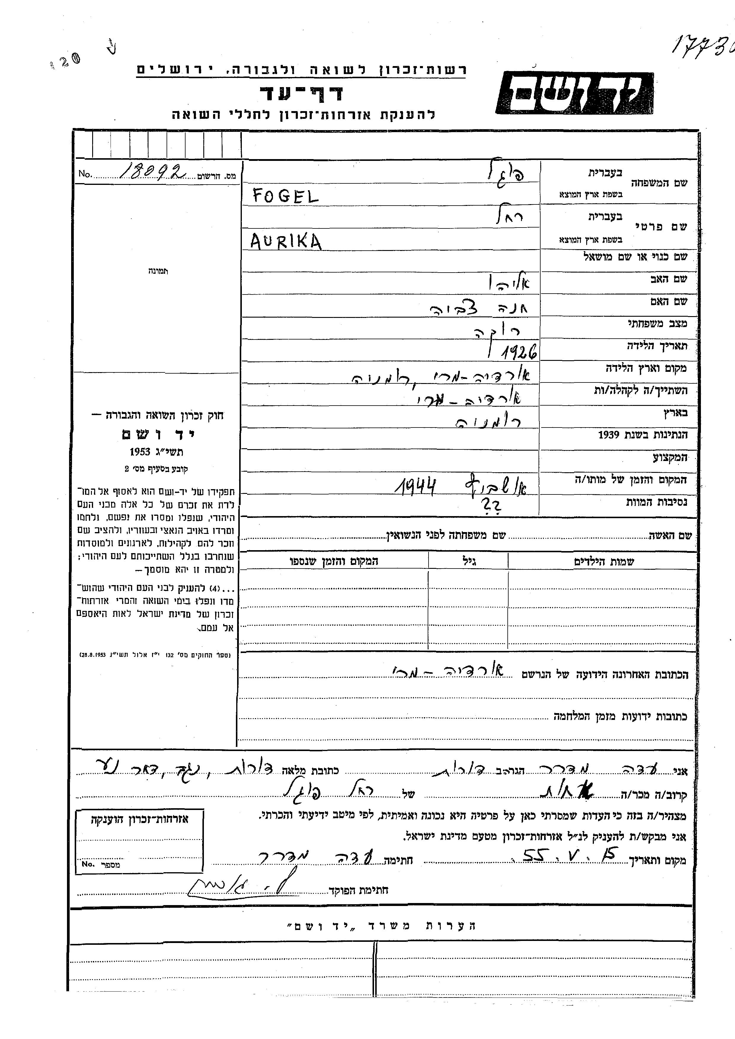 Fogel Aurika Rakhel 1926 Oradea, Rumänien Gedenkblatt