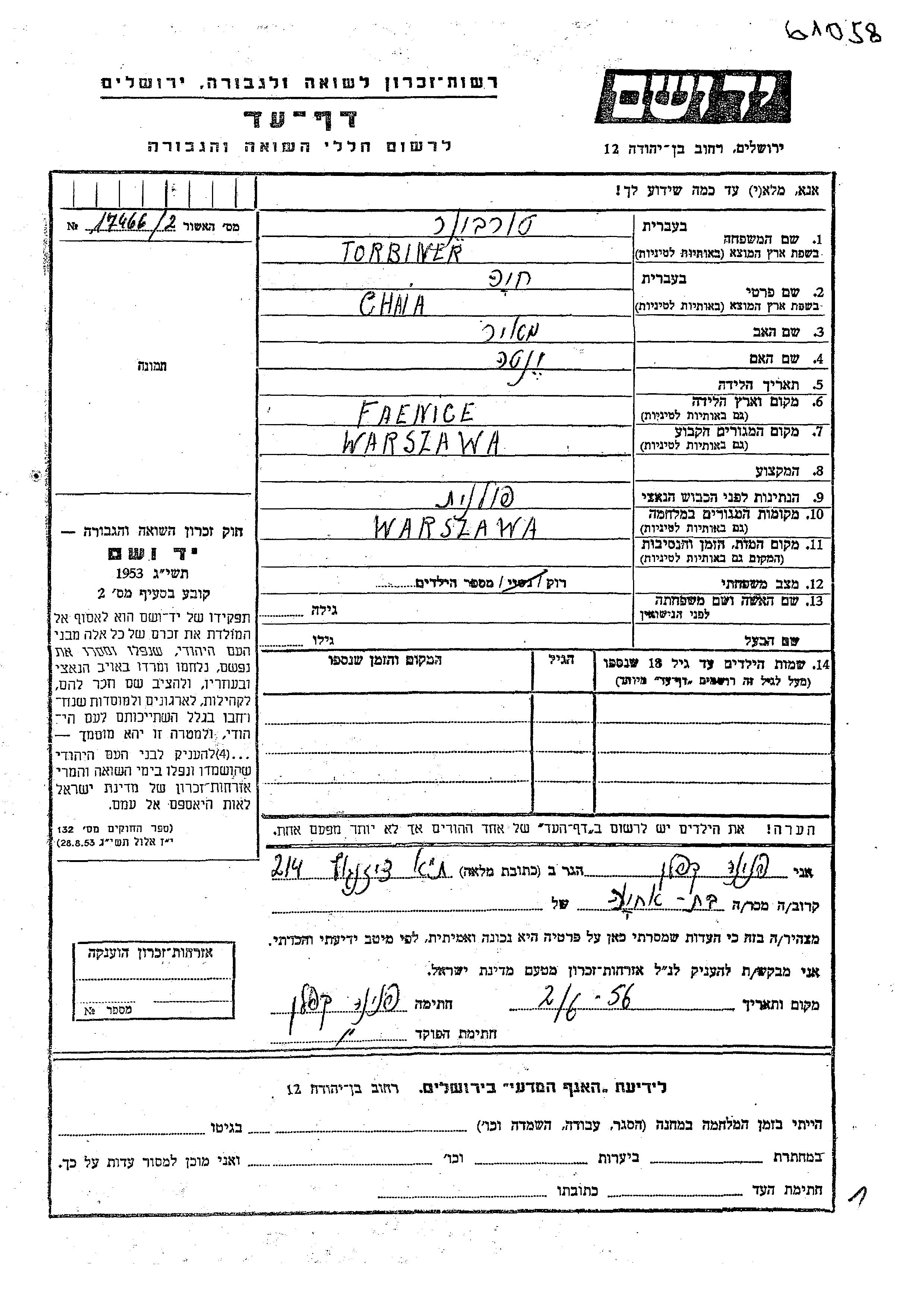 Chaia Torbiner wurde im Jahr 1900 in Falenica, Polen geboren. Sie war die Tochter von Meir und Yenta. Sie war Arbeiter/-in und Ledig. Vor dem Zweiten Weltkrieg lebte sie in Warsaw, Polen. Während des Krieges war sie in Warsaw, Polen.