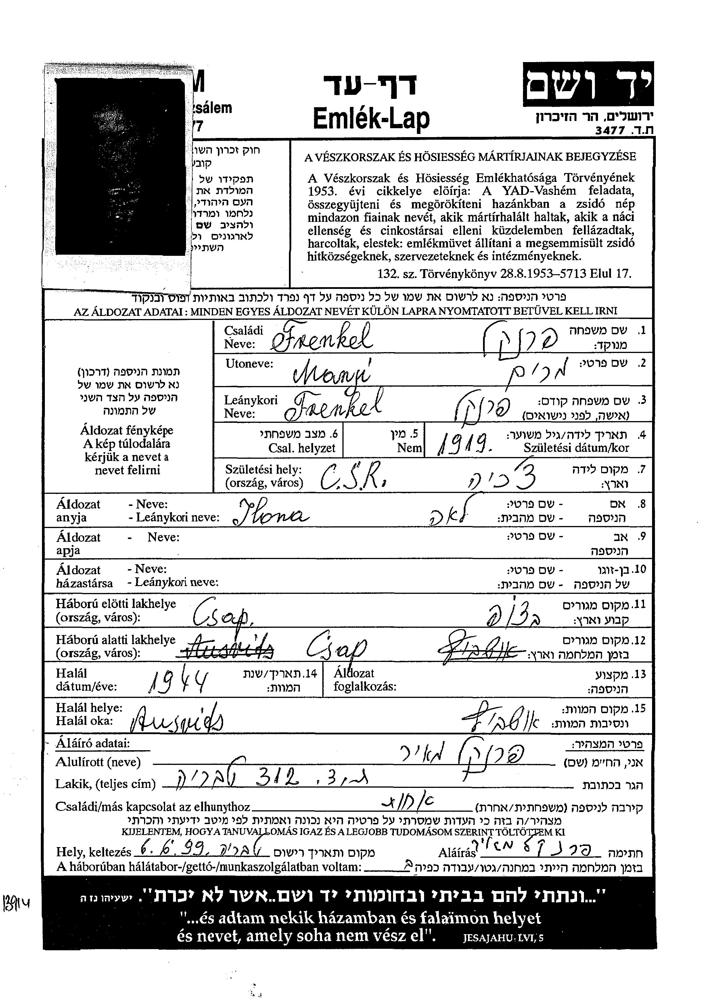 Frenkel Manji Miriam 1919 Csap, Tschechoslowakei Gedenkblatt