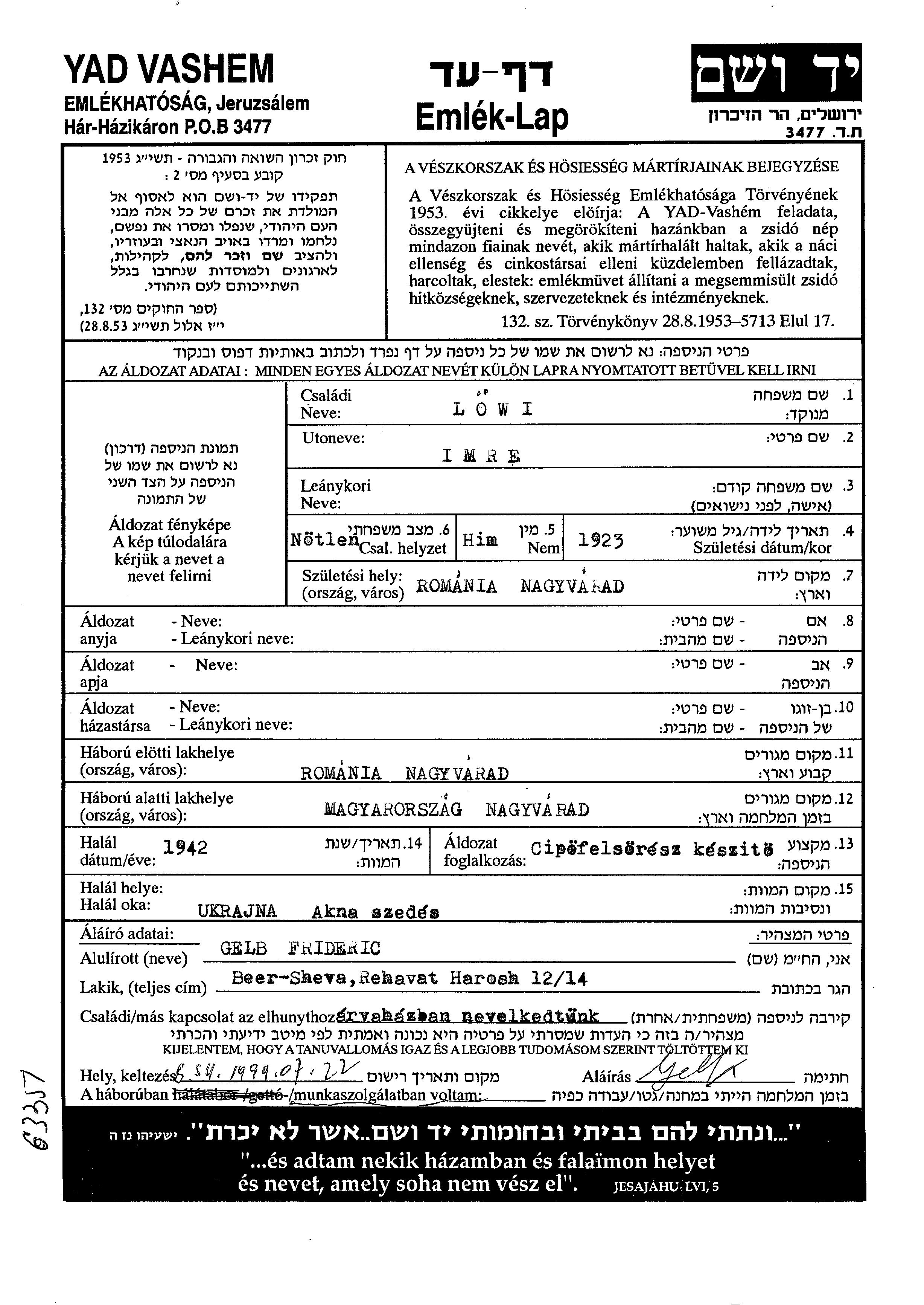 Imre Löwi wurde im Jahr 1923 in Nagyvarad, Rumänien geboren. Er war Ledig. Vor dem Zweiten Weltkrieg lebte er in Nagyvarad, Rumänien. Während des Krieges war er in Nagyvarad, Rumänien.