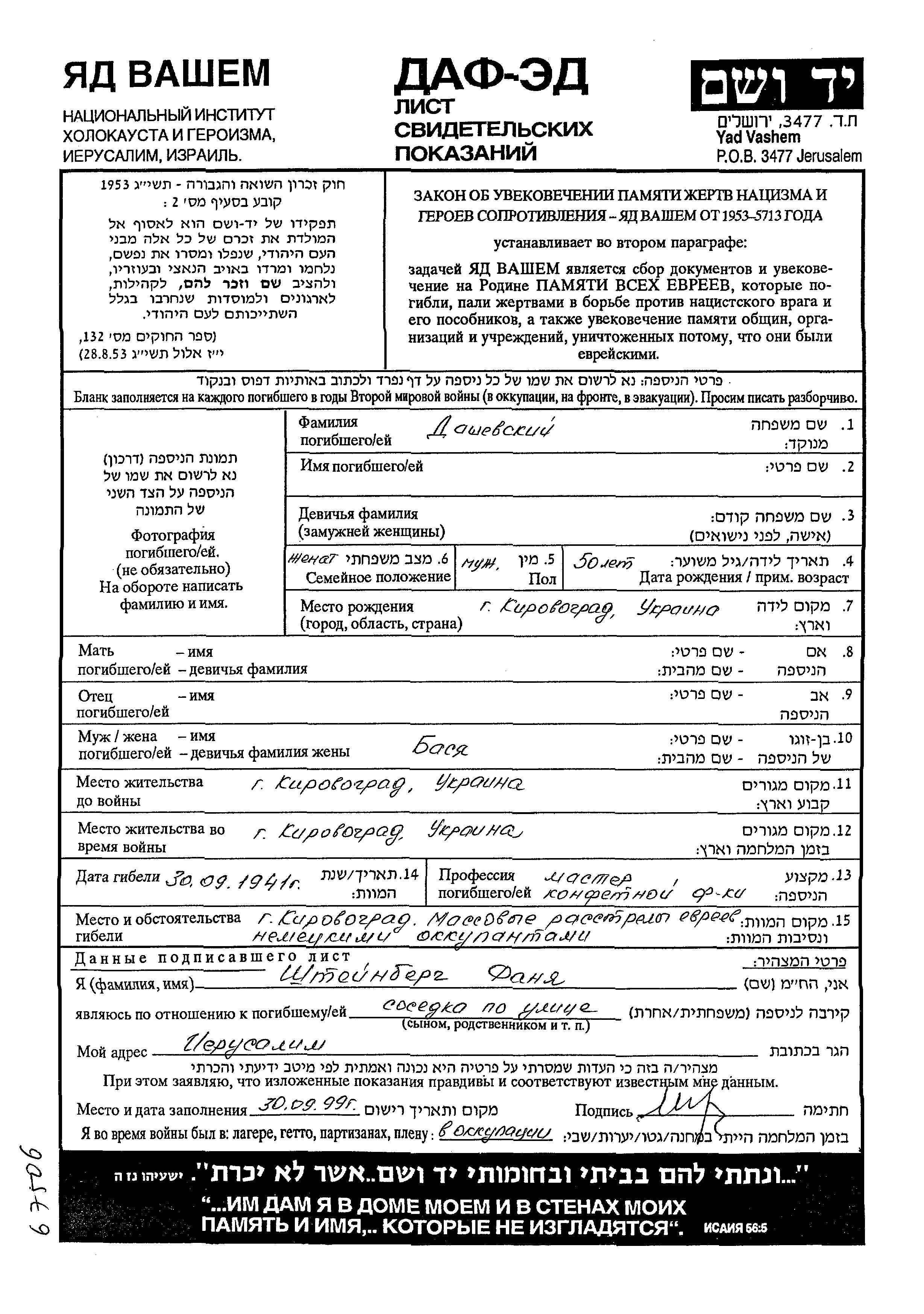 Vorname unbekannt Dashevski wurde in Kirovograd, Ukraine (UdSSR) geboren. Er war mit Basia Verheiratet. Vor dem Zweiten Weltkrieg lebte er in Kirovograd, Ukraine (UdSSR). Während des Krieges war er in Kirovograd, Ukraine (UdSSR).