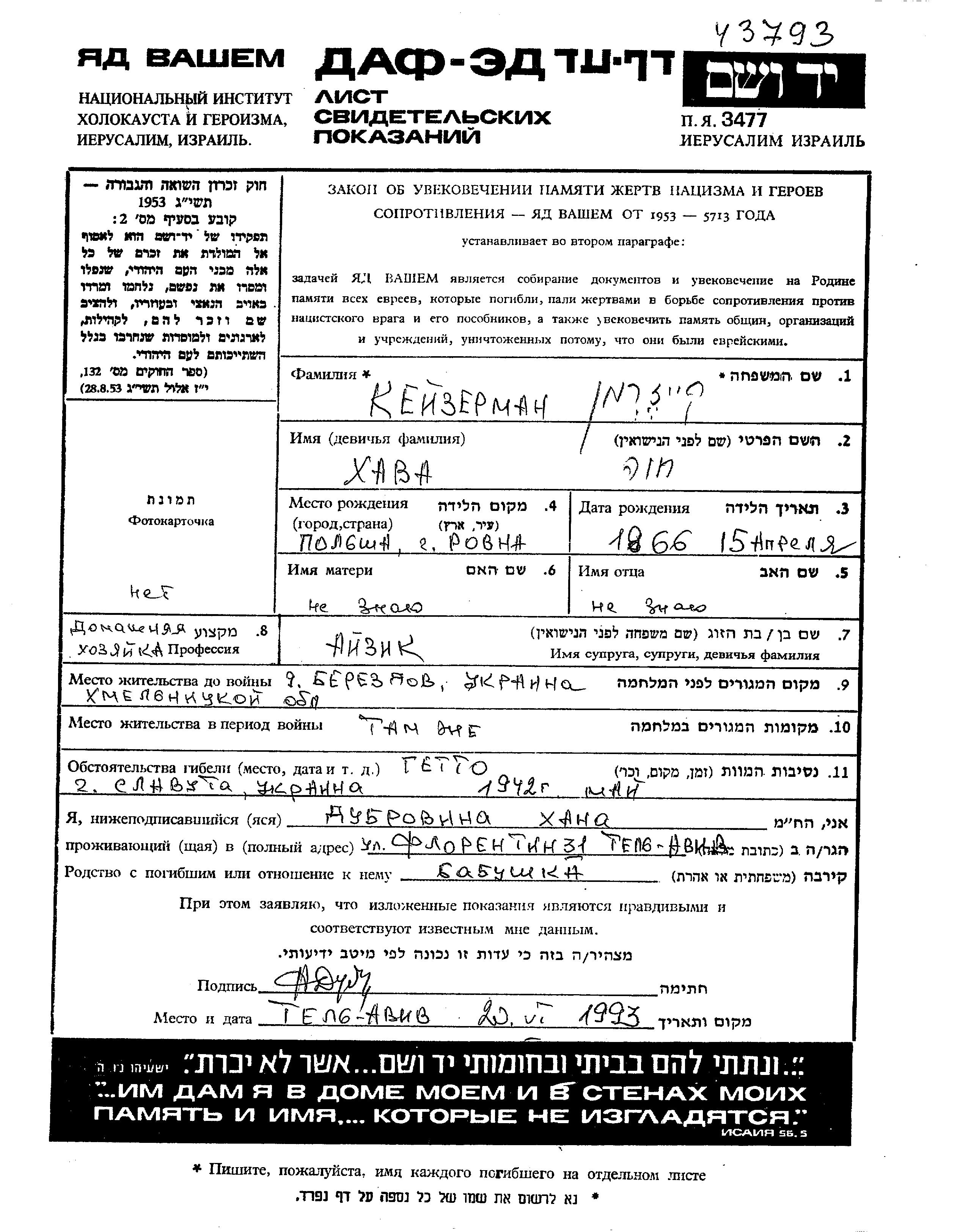 Khava Keizerman wurde im Jahr 1866 in Rowne, Polen geboren. Sie war Hausfrau und mit Aizik Verheiratet. Vor dem Zweiten Weltkrieg lebte sie in Berezdov, Ukraine (UdSSR). Während des Krieges war sie in Berezdov, Ukraine (UdSSR).