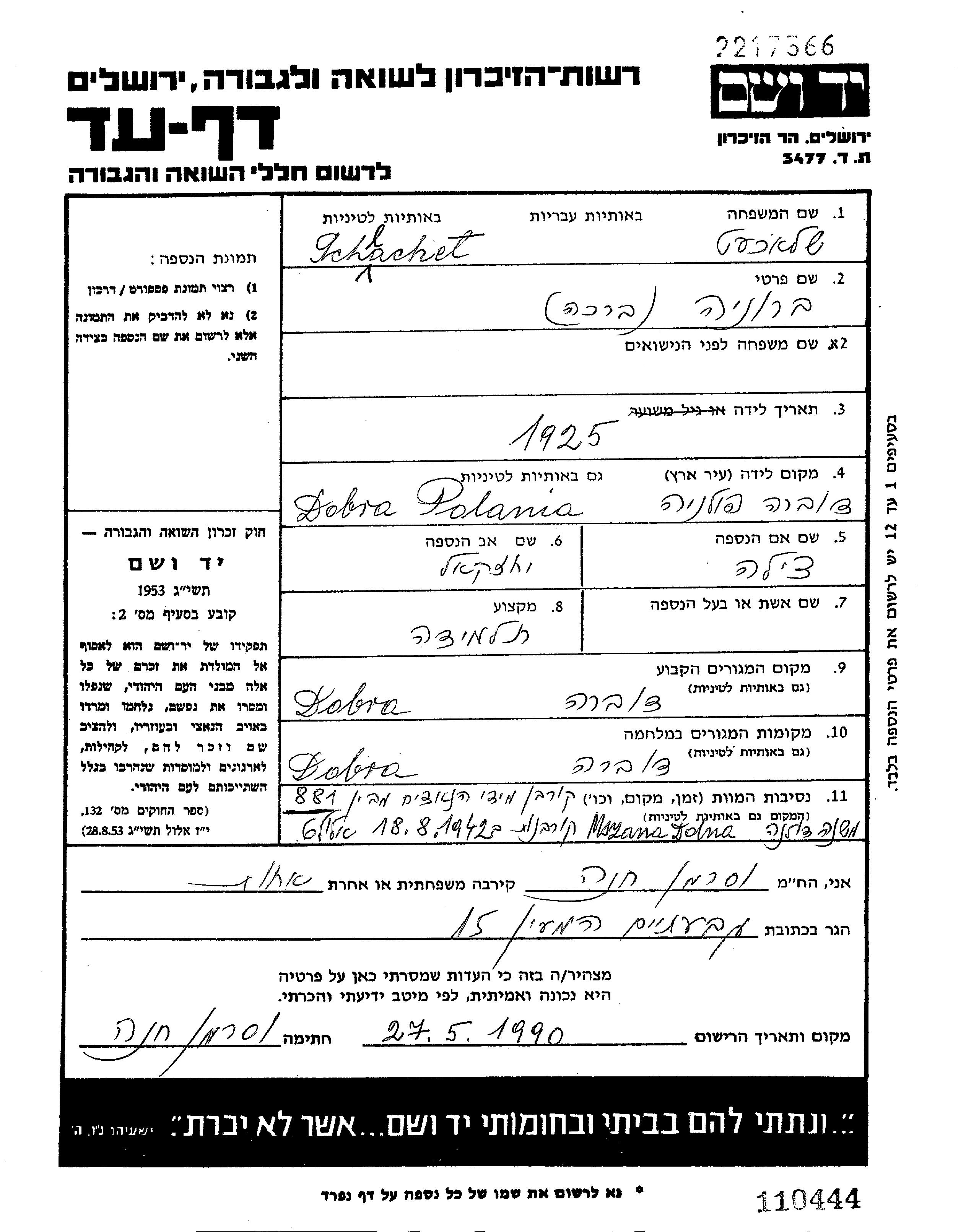 Bronia Brakha Schlachet wurde in Dobra, Polen geboren. Sie war die Tochter von Yekhezkel und Cyla, geb. Kaufman. Sie war Schüler/-in und Kind. Vor dem Zweiten Weltkrieg lebte sie in Dobra, Polen. Während des Krieges war sie in Dobra, Polen.