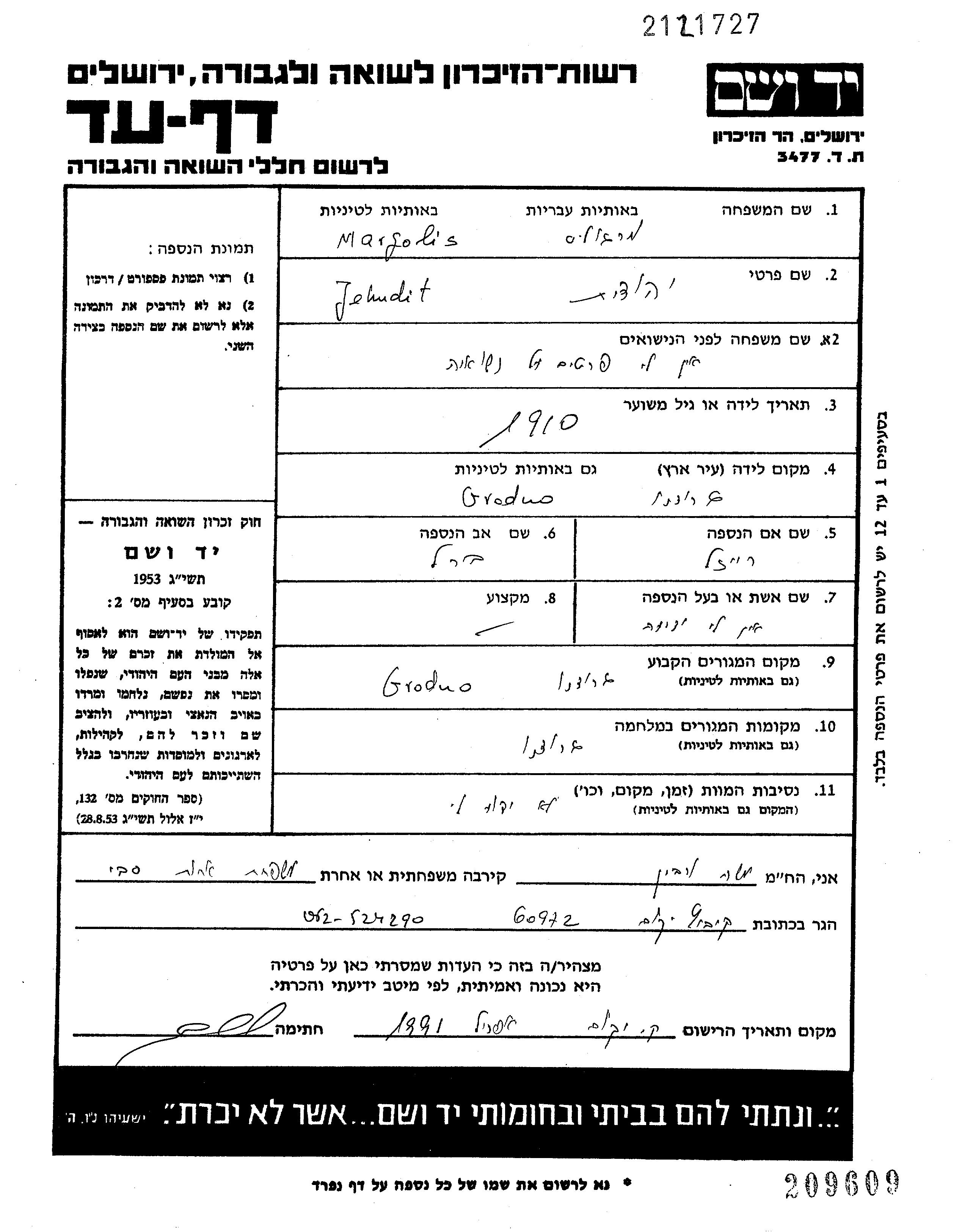Jehudit Margolis wurde im Jahr 1910 in Grodno, Polen geboren. Sie war die Tochter von Berl und Reisl, geb. Pik. Vor dem Zweiten Weltkrieg lebte sie in Grodno, Polen. Während des Krieges war sie in Grodno, Polen.