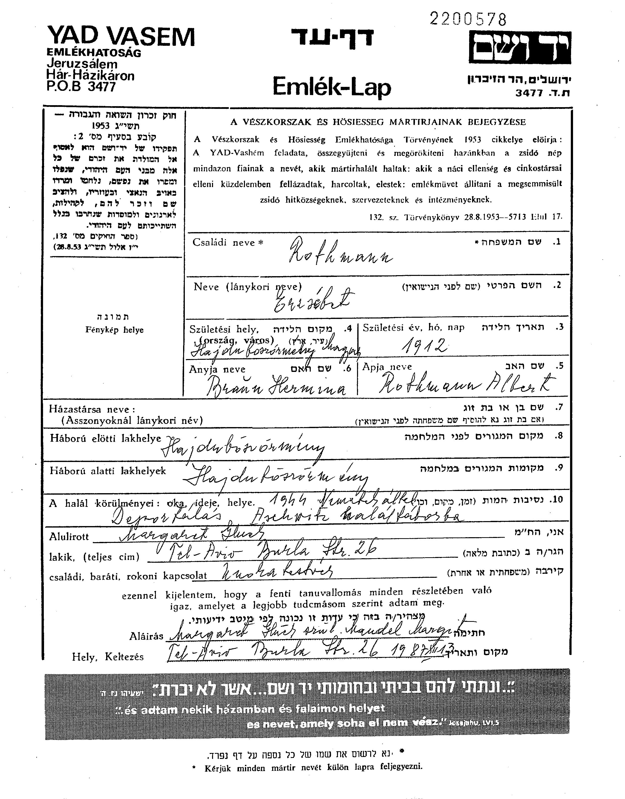 Erzsebet Rothmann wurde im Jahr 1912 in Hajduboszormeny, Ungarn geboren. Sie war die Tochter von Albert und Hermina, geb. Braun. Vor dem Zweiten Weltkrieg lebte sie in Hajduboszormeny, Ungarn. Während des Krieges war sie in Hajduboszormeny, Ungarn.