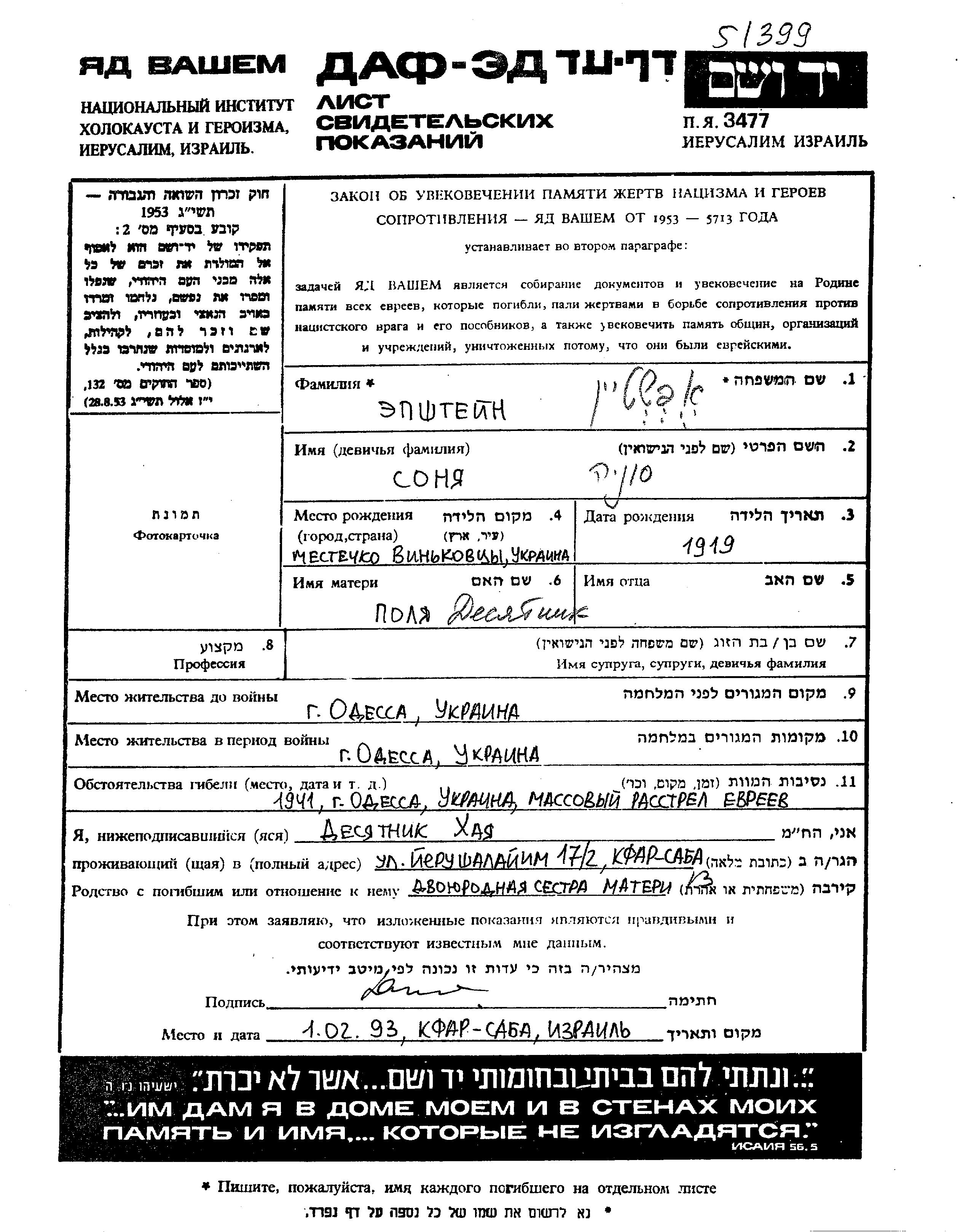 Epshtein Sonia 1919 Odessa, Ukraine (UdSSR) Gedenkblatt