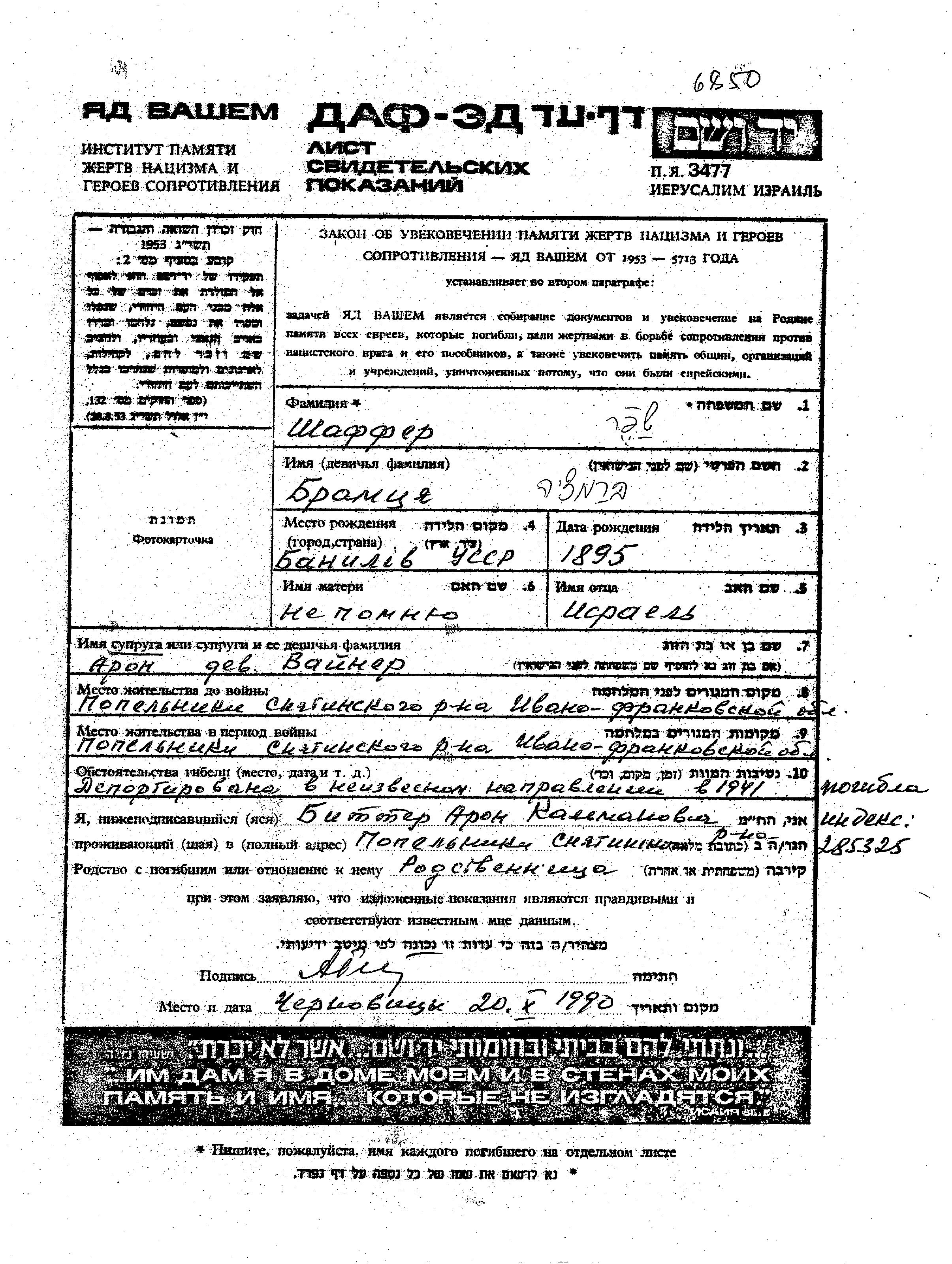 Bramtzya Shafer, geb. Vainer wurde im Jahr 1895 in Banila, Rumänien geboren. Sie war die Tochter von Israel. Sie war mit Aron Verheiratet. Vor dem Zweiten Weltkrieg lebte sie in Popielnik, Polen. Während des Krieges war sie in Popielnik, Polen.