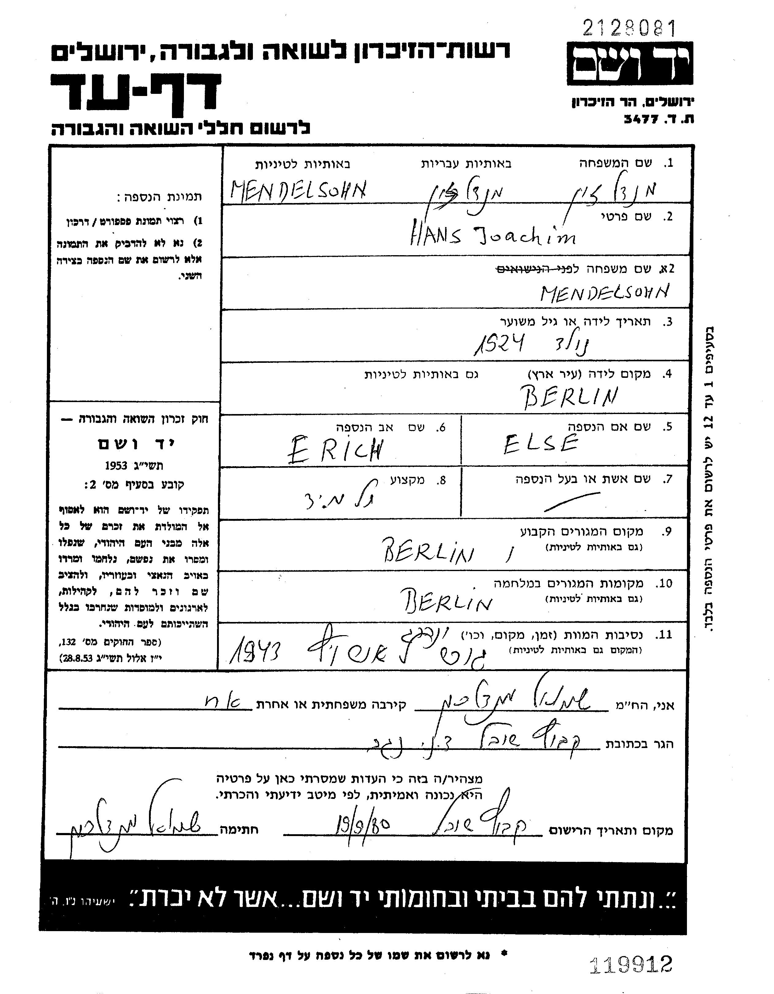 Joachim Hans Mendelsohn wurde im Jahr 1924 in Berlin, Deutsches Reich geboren. Er war der Sohn von Erich und Else, geb. Hirsch. Er war Schüler/-in und Ledig. Vor dem Zweiten Weltkrieg lebte er in Berlin, Deutsches Reich. Während des Krieges war er in Berlin, Deutsches Reich.