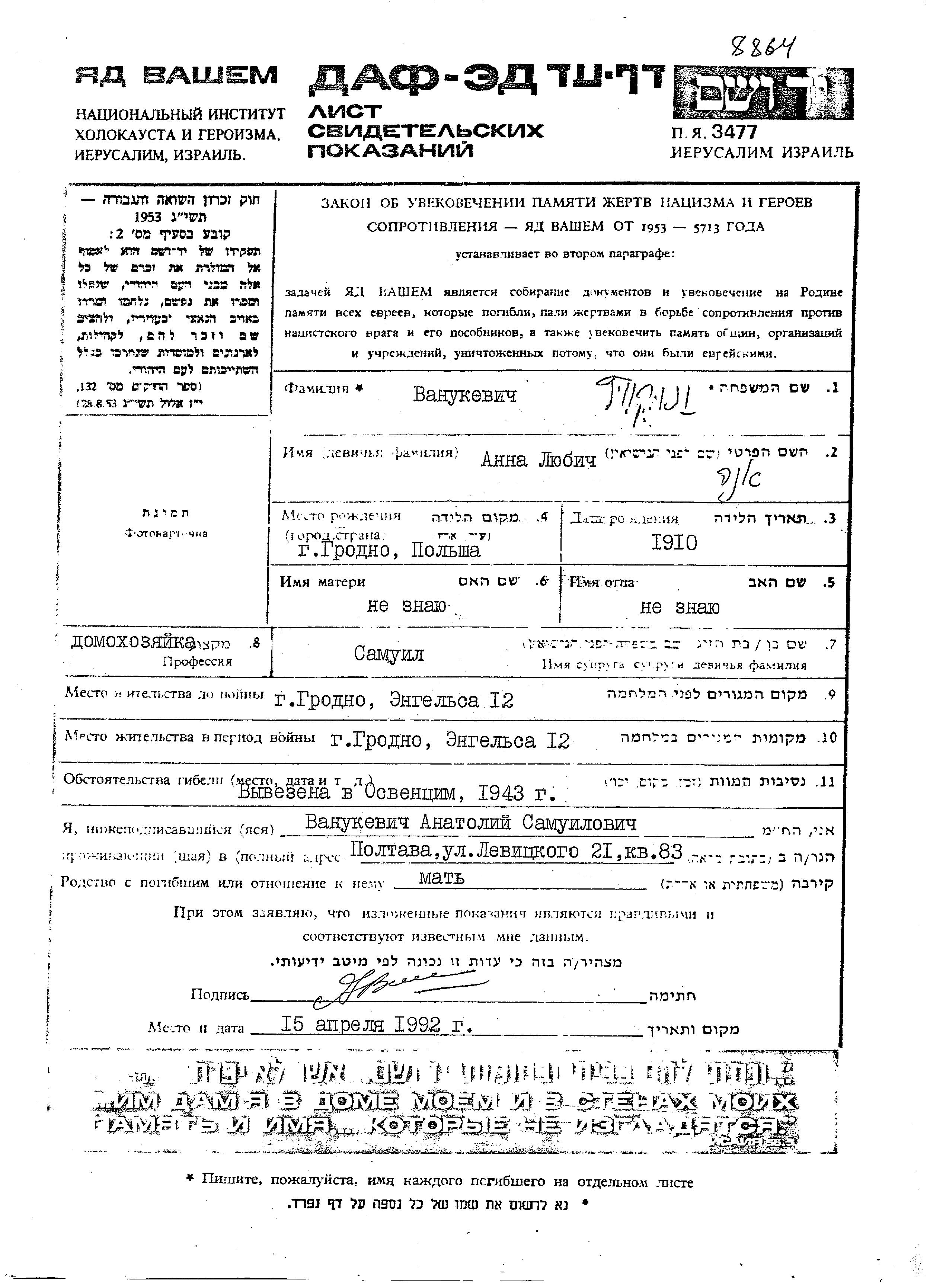 Ana Vanukevich, geb. Lyubich wurde im Jahr 1910 in Grodno, Polen geboren. Sie war Hausfrau und mit Samuil Verheiratet. Vor dem Zweiten Weltkrieg lebte sie in Grodno, Polen. Während des Krieges war sie in Grodno, Polen.