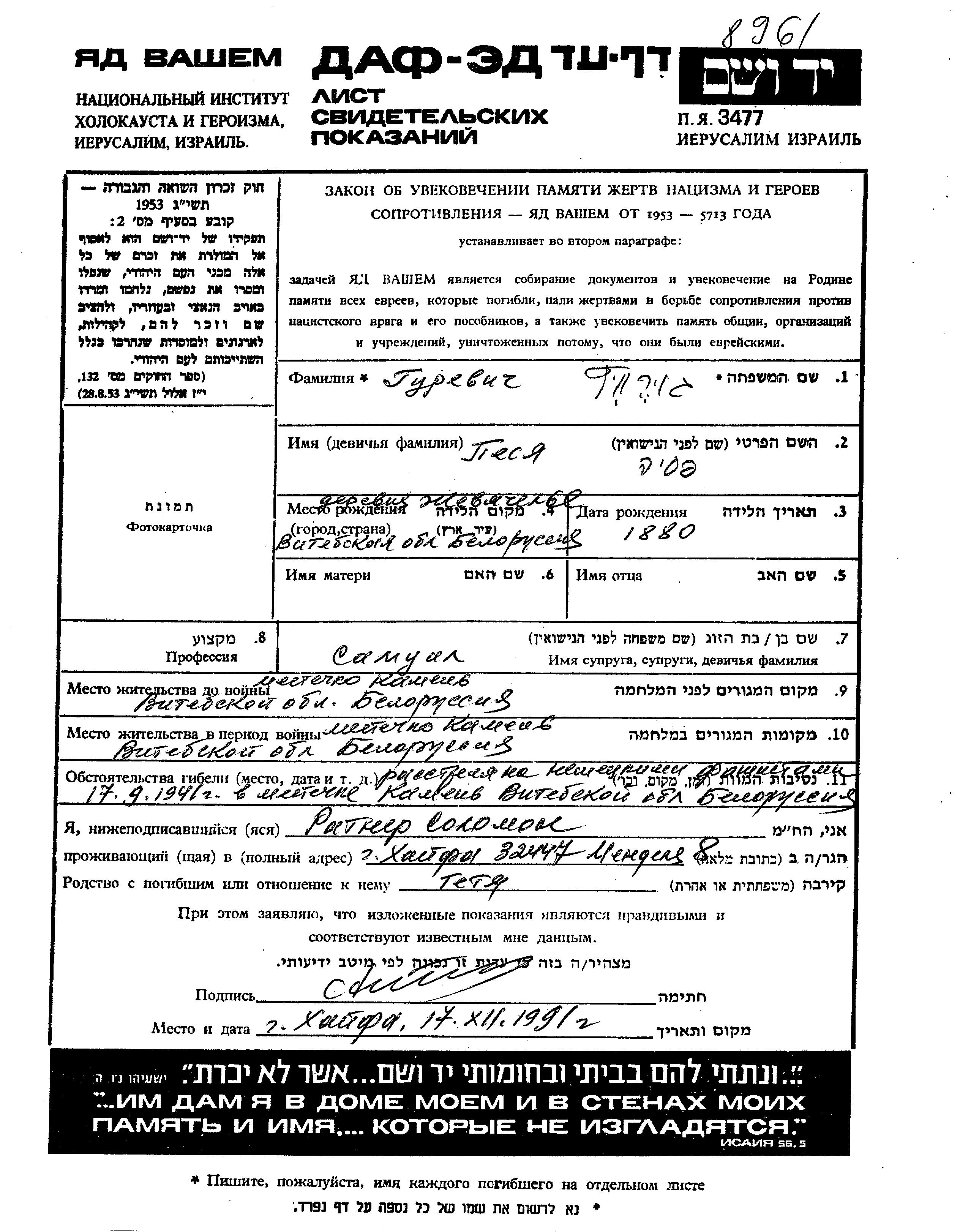 Pesia Gurevich wurde im Jahr 1880 in Zhevyachelye, Weißrussland (UdSSR) geboren. Sie war mit Samuil Verheiratet. Vor dem Zweiten Weltkrieg lebte sie in Kamen, Weißrussland (UdSSR). Während des Krieges war sie in Kamen, Weißrussland (UdSSR).