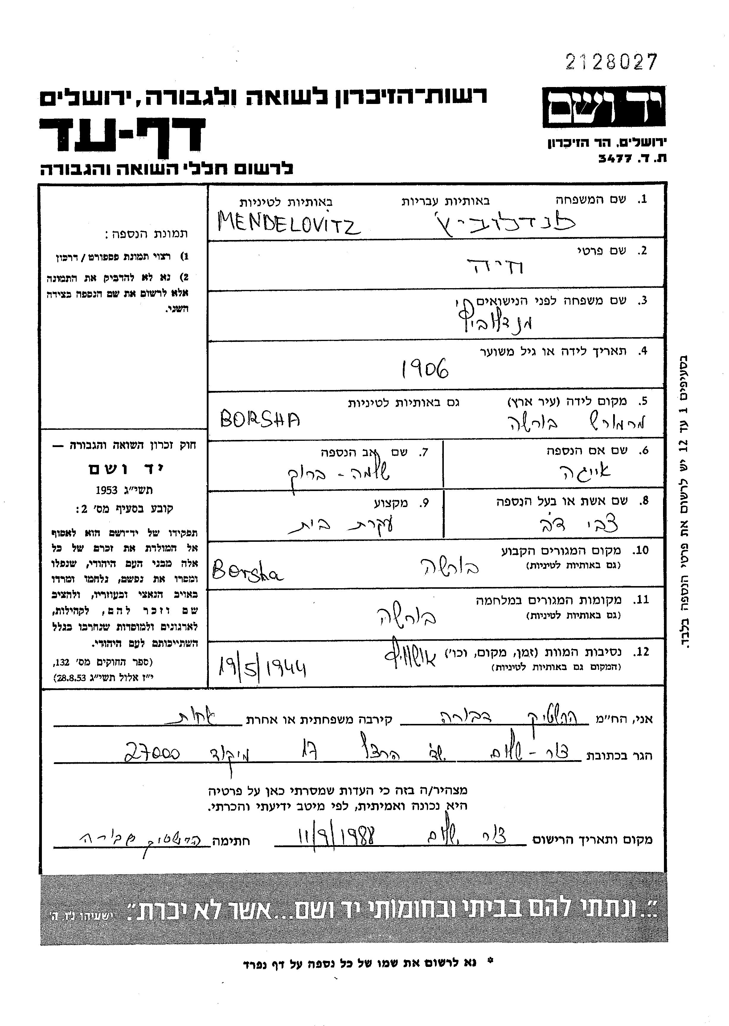Khaia Mendelovitz, geb. Mendlovitz wurde im Jahr 1906 in Borsa, Rumänien geboren. Sie war die Tochter von Shlomo Barukh und Eiga. Sie war Hausfrau und mit Tzvi Dov Verheiratet. Vor dem Zweiten Weltkrieg lebte sie in Borsa, Rumänien. Während des Krieges war sie in Borsa, Rumänien.
