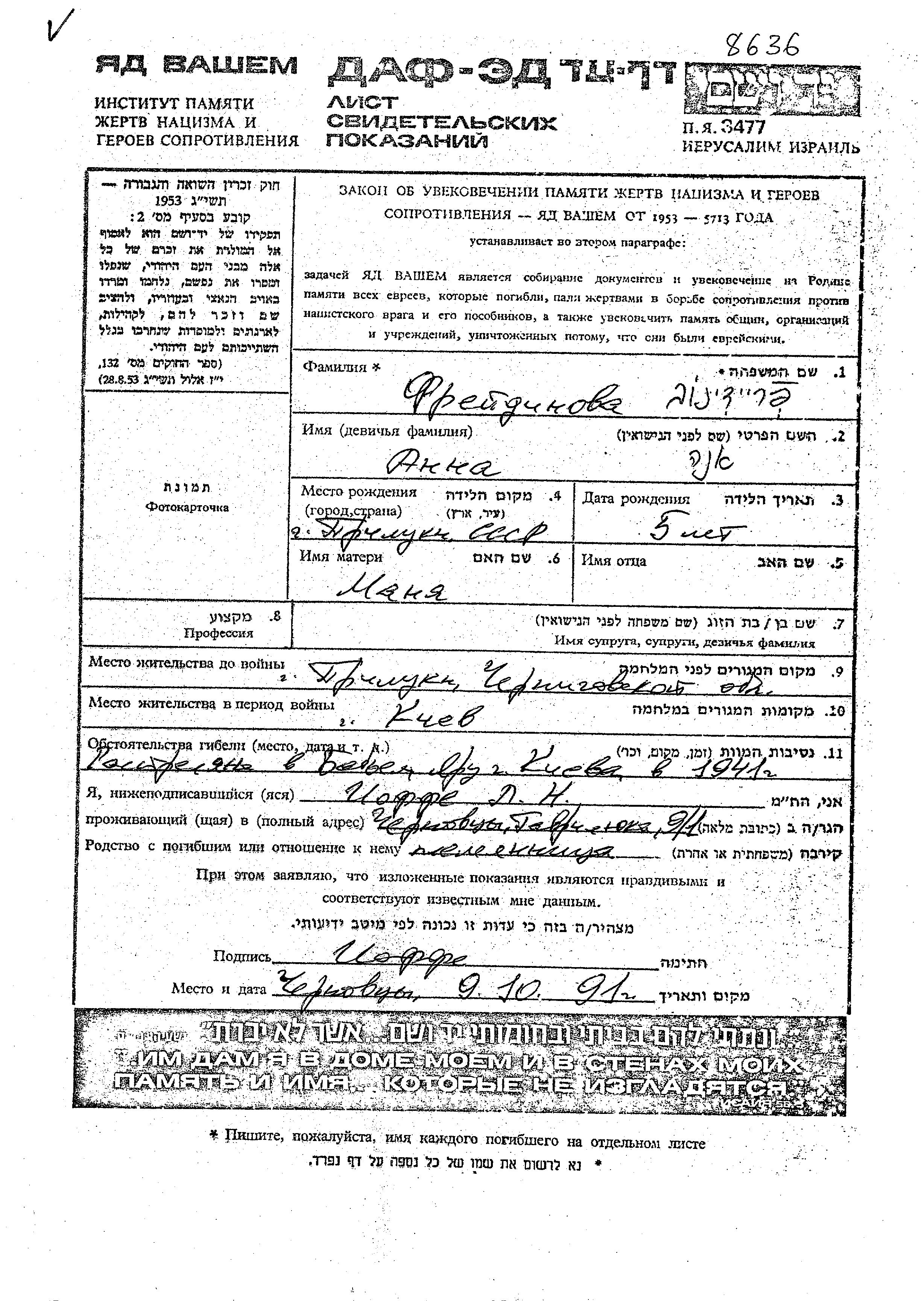 Ana Freidinov wurde in Priluki, Ukraine (UdSSR) geboren. Sie war die Tochter von Mania. Sie war Kind. Vor dem Zweiten Weltkrieg lebte sie in Priluki, Ukraine (UdSSR). Während des Krieges war sie in Kiyev, Ukraine (UdSSR).